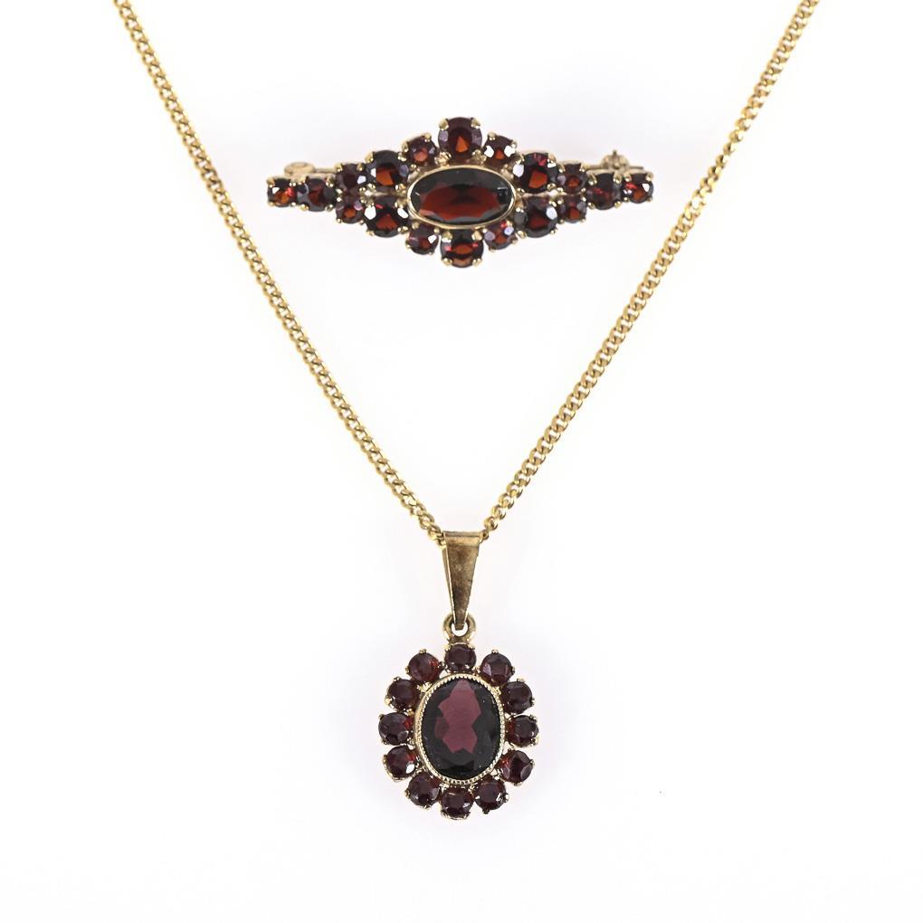 Anhänger und Brosche mit Granatbesatz. Panzerkette mit Ringfederschließe. Kugelhaken.