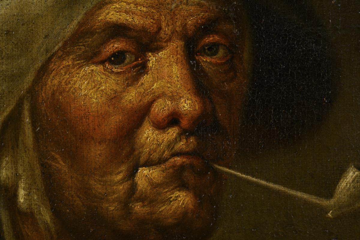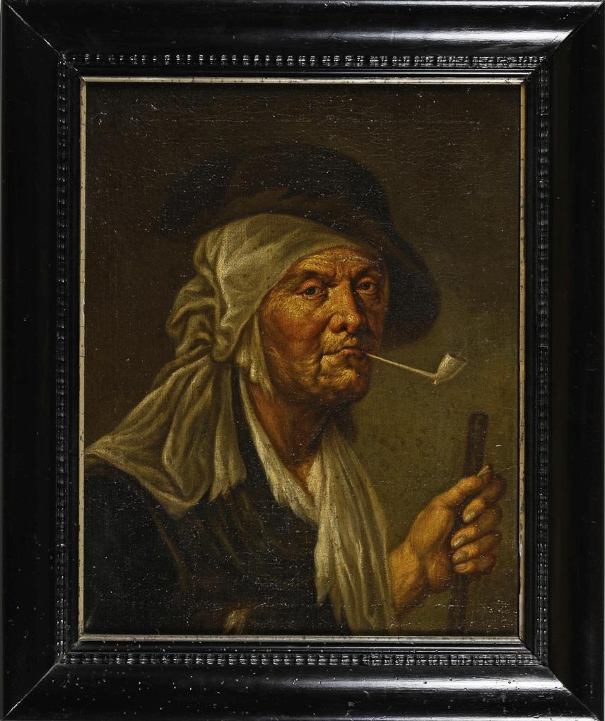 Porträt eines Pfeife rauchenden Mannes mit Stock und ärmlicher Kleidung. Altrestauriert, Altersspuren.