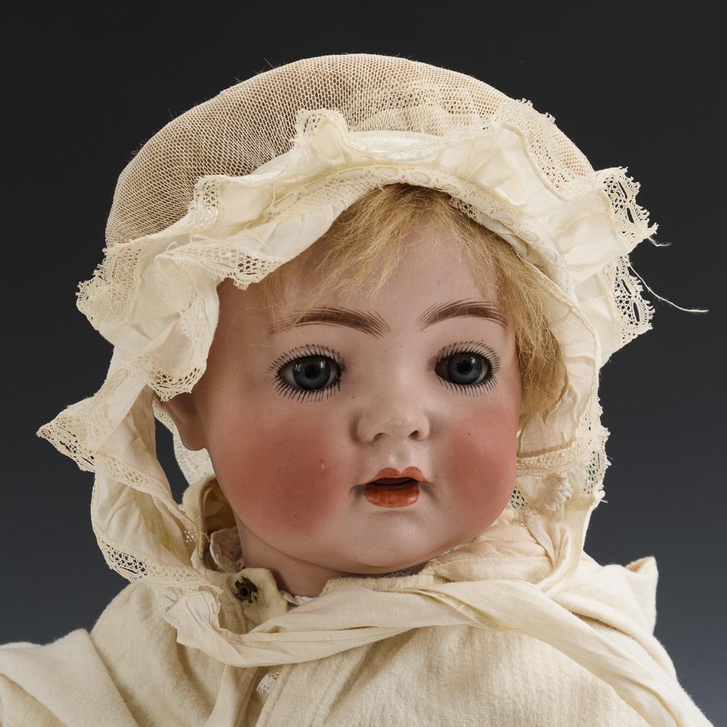 Kurbelkopf, blaue Schlafaugen, Wimpern, passend ergänzte Mohairperücke (originale alte Perücke anbei). 5-teiliger Sitzbabykörper. Mit weißer Babyausstattung bekleidet: Unterwäsche, Taufkleid, Umhang, Mütze. Kopf durchleuchtet: ohne Defekte.