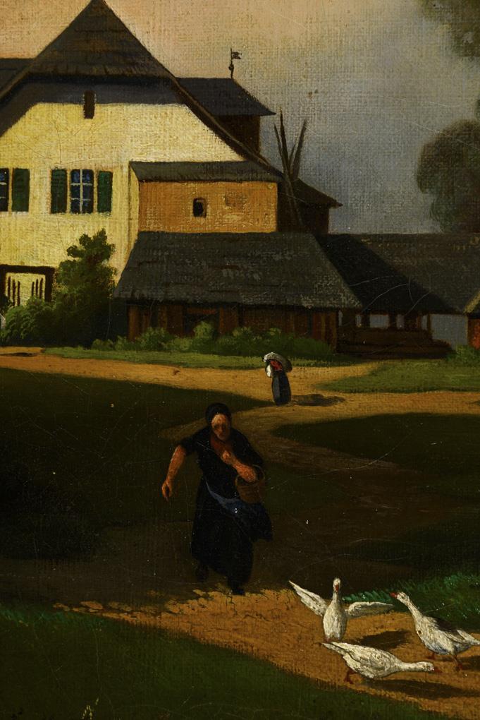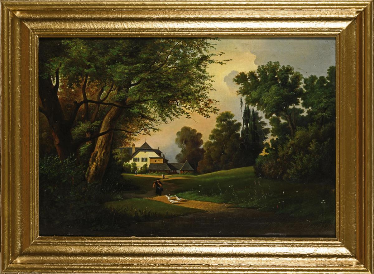 Staffagefiguren auf dem Weg nahe dem Haus zwischen dicht stehenden Bäumen. Leichte Altersspuren.