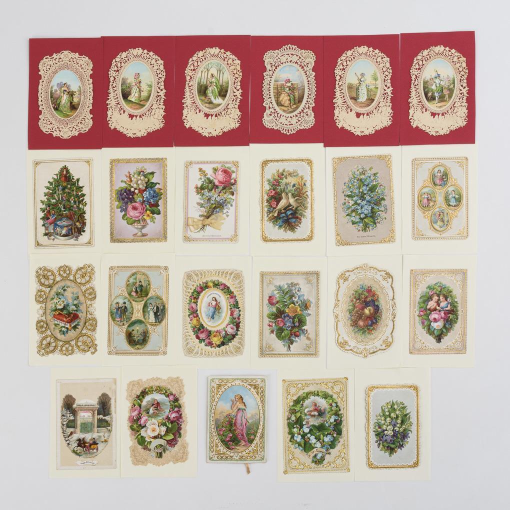 Farblithografien teils geprägt und mehrschichtig, zumeist Stanzspitze teils goldstaffiert. Maximal 11,5 x 7,5 cm.