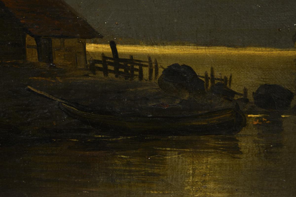 Windmühle und Bauernhaus am Wasser im Schein des Vollmondes mit Blick zu den Booten am Horizont. Altersspuren.