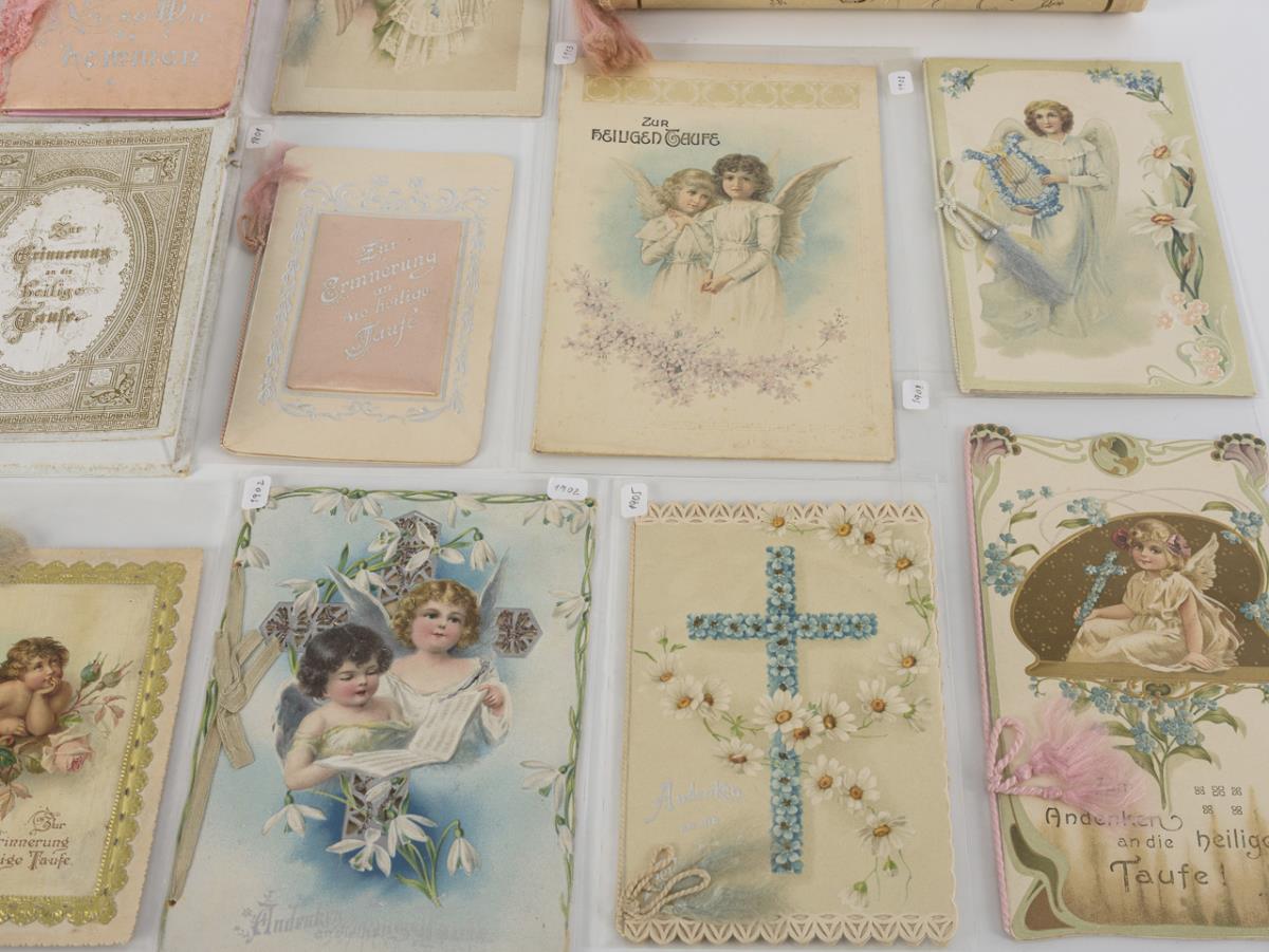 4 Pappschatullen in Buchform mit kaschiertem Titel auf dem Deckel; innen 1x als Bildkasten mit Johannes dem Täufer (Farblithografien), 2 Umschläge mit Samt, 1 Zierumschlag mit Gaze, Prägepapier, Farblithografien und Stoffrose. 1 gerollter Taufbrief in bedrucktem Rollenetui aus Karton. 16 lose Taufkarten. Schatullen einige Alters-/Gebrauchsspuren, 1x Scharnier geklebt..
