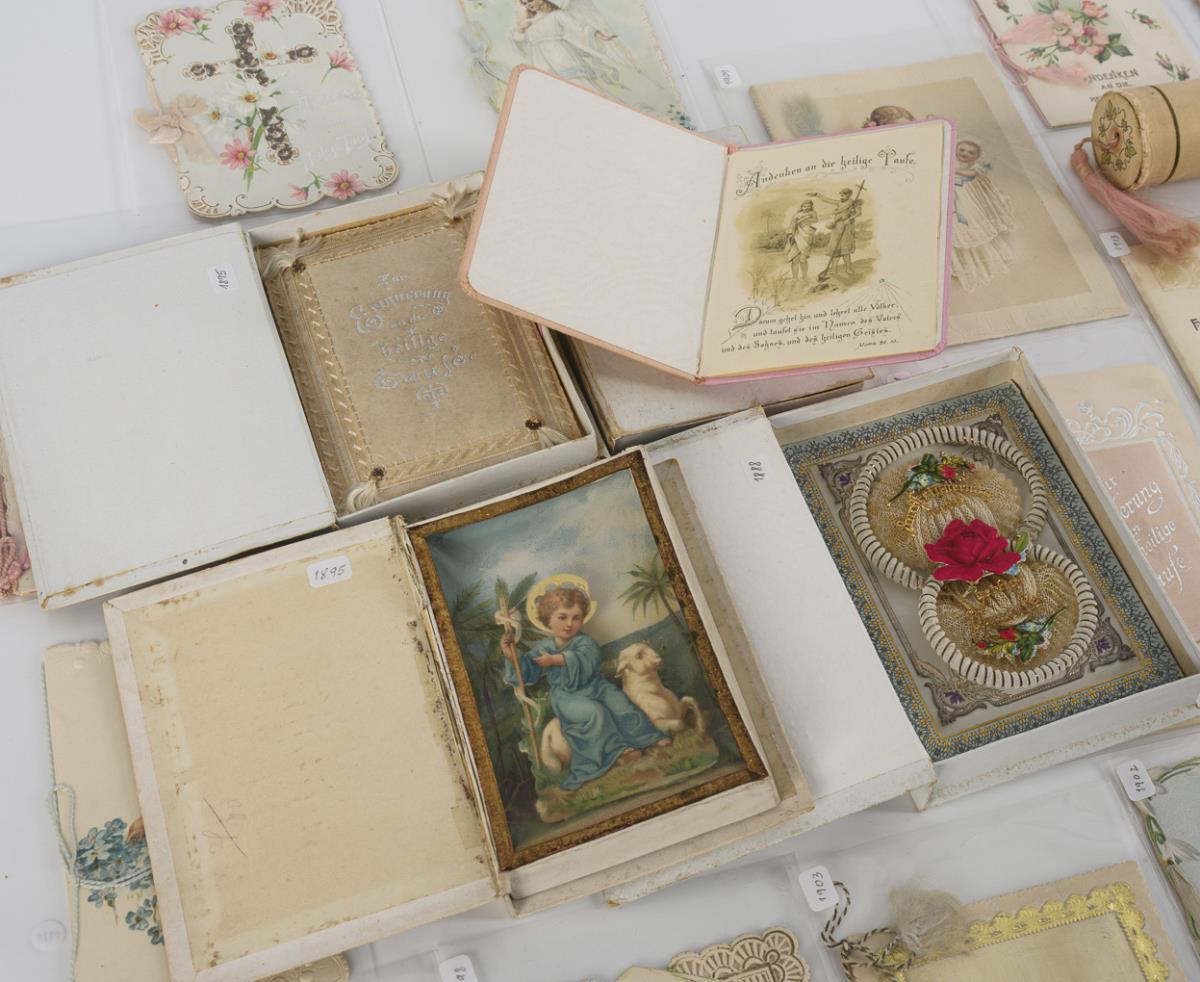 Papier bzw. Karton, zumeist Prägedruck mit Farblithografien, teils gold- und silberstaffiert, verschiedene Materialien. L Rolle 20 cm, Schatullen maximal 13 x 9,5 cm, Karten maximal 17 x 11 cm.