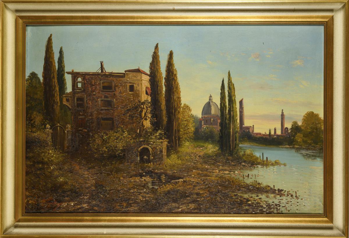 Undeutlich signiert: Mediterrane Landschaft mit Villa