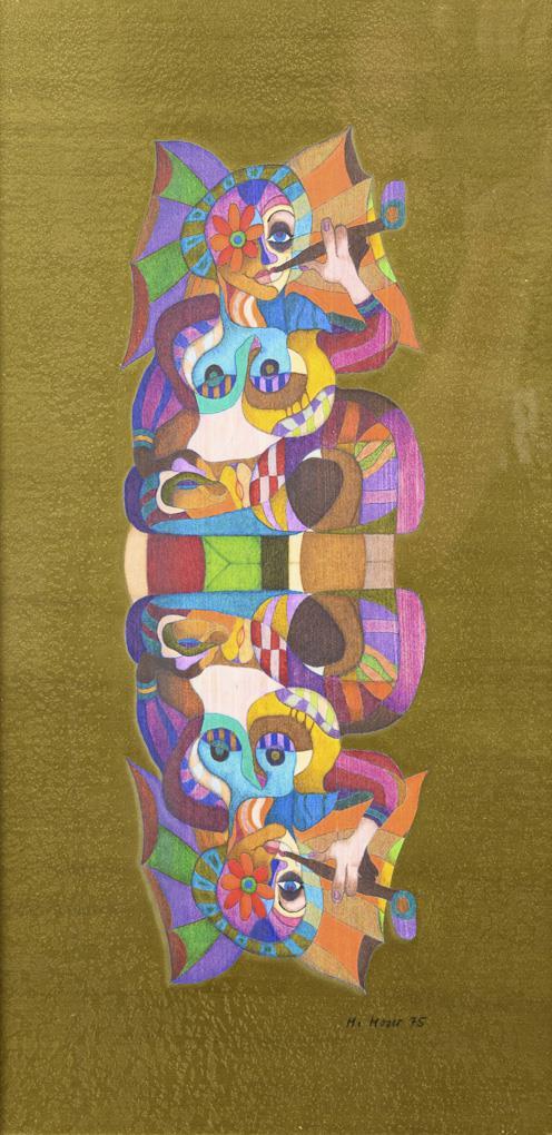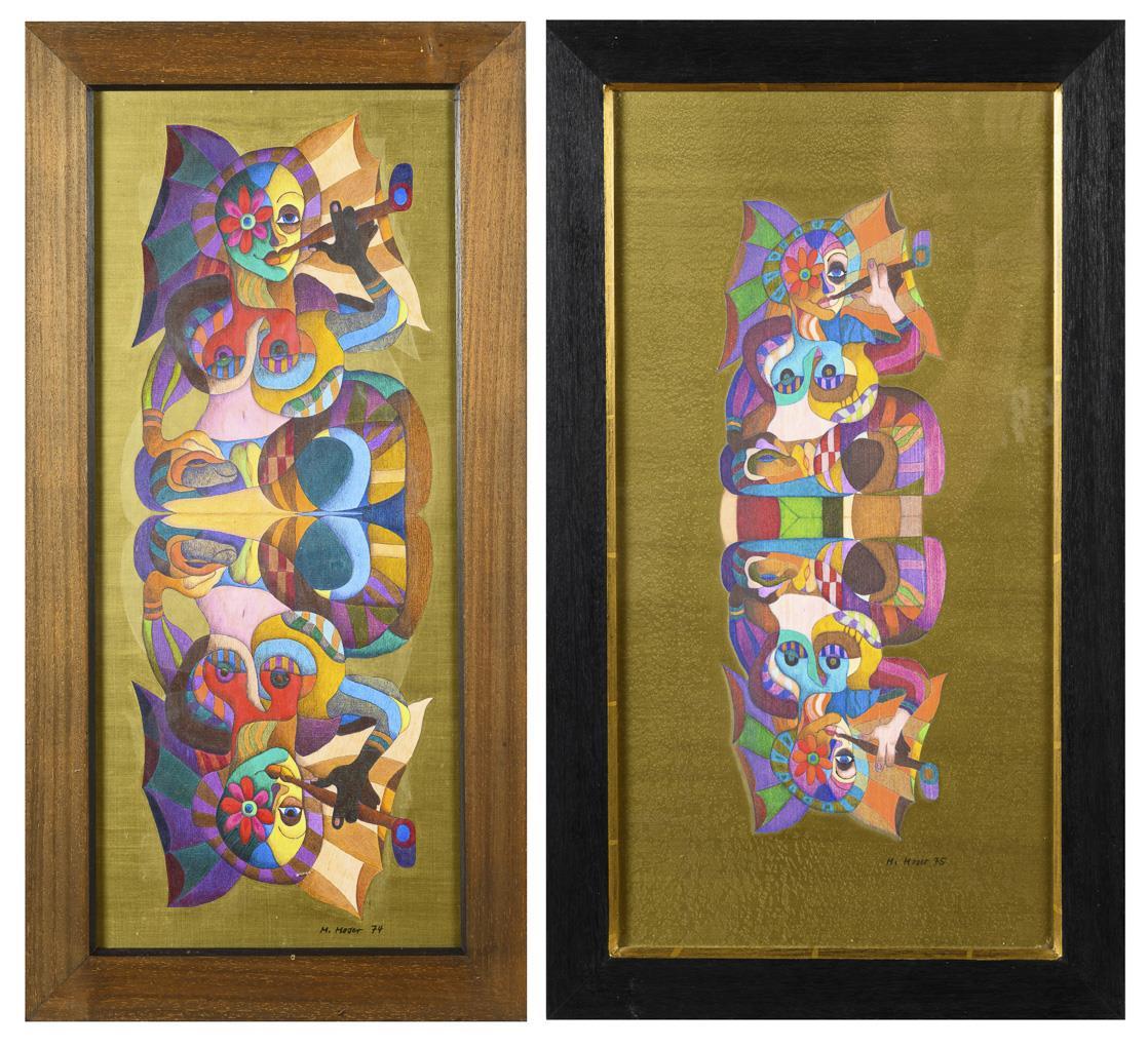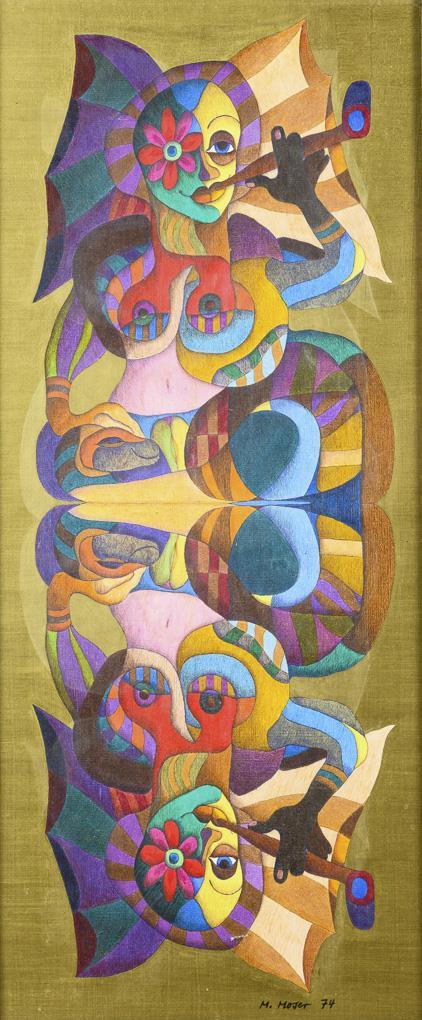 2 ähnliche, achsengespiegelte weibliche Figuren auf goldfarbenem Grund: Platte: 73 x 32 cm, gerahmt & hinter Glas: 83,5 x 43,5 cm, Kohlesignatur, [19]74 | Platte: 56 x 29 cm, gerahmt & hinter Glas: 63 x 36,5 cm, Kohlesignatur, [19]75.