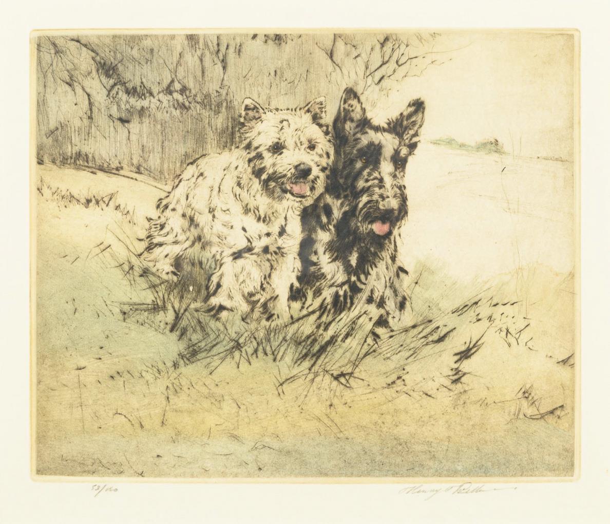 Undeutlich signiert - Henry?: Terrier und Schnauzer am Waldrand