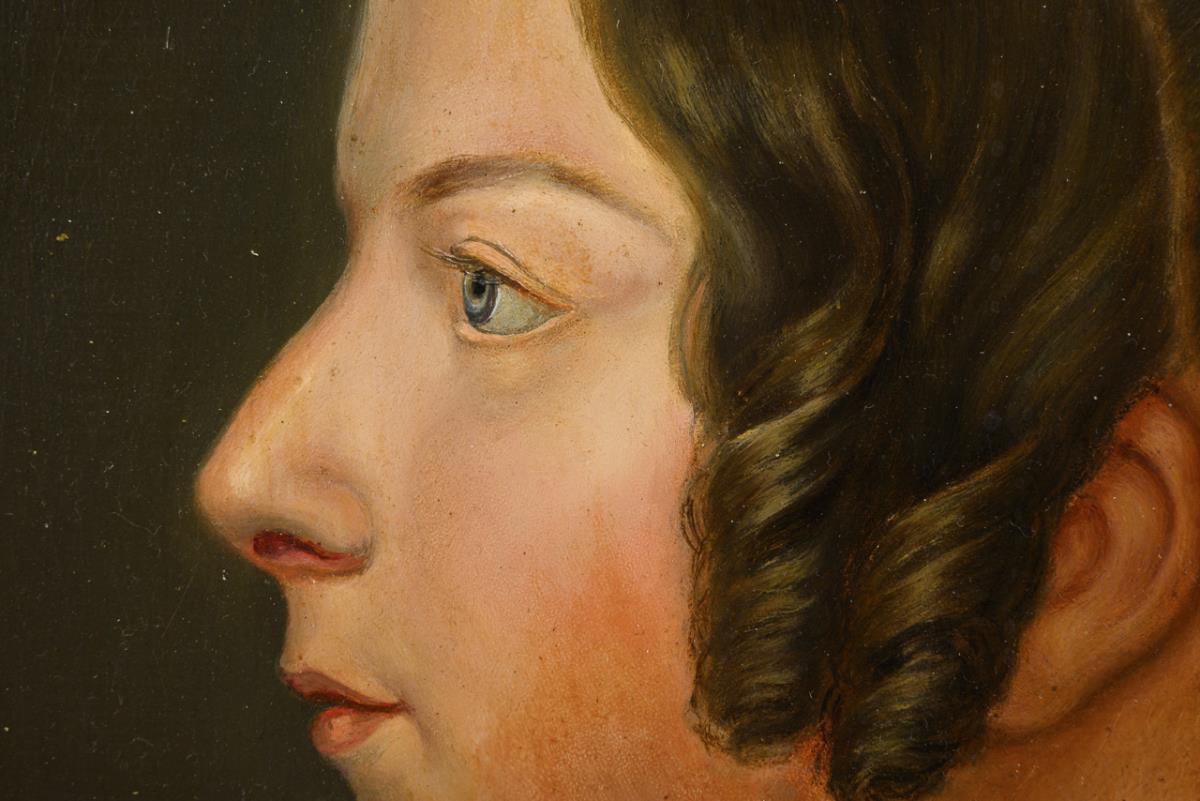 Porträt einer jungen Frau mit Löckchen im Profil. Leichte Altersspuren.