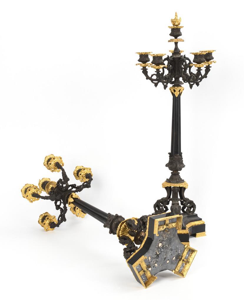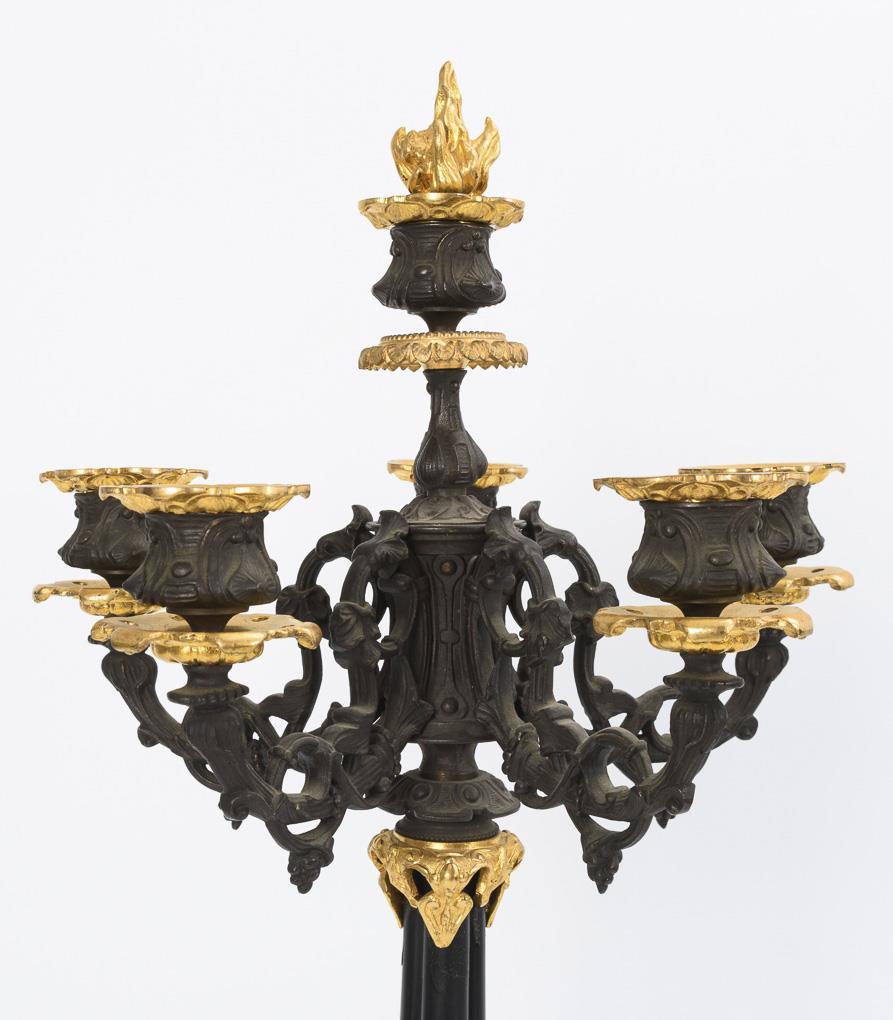 Im noblen Kontrast von tiefem Schwarz und glänzendem Gold prächtig gestaltete Kerzenleuchter. 3-seitiger Sockel mit filigranen Volutenbeinen, vasenartiger Schaftansatz für den Marmor-Säulenschaft sowie reich verzierter Aufsatz mit 5 Volutenarmen und Löschstopfen in der erhöhten Zentraltülle. Ausbesserungen am Marmor.