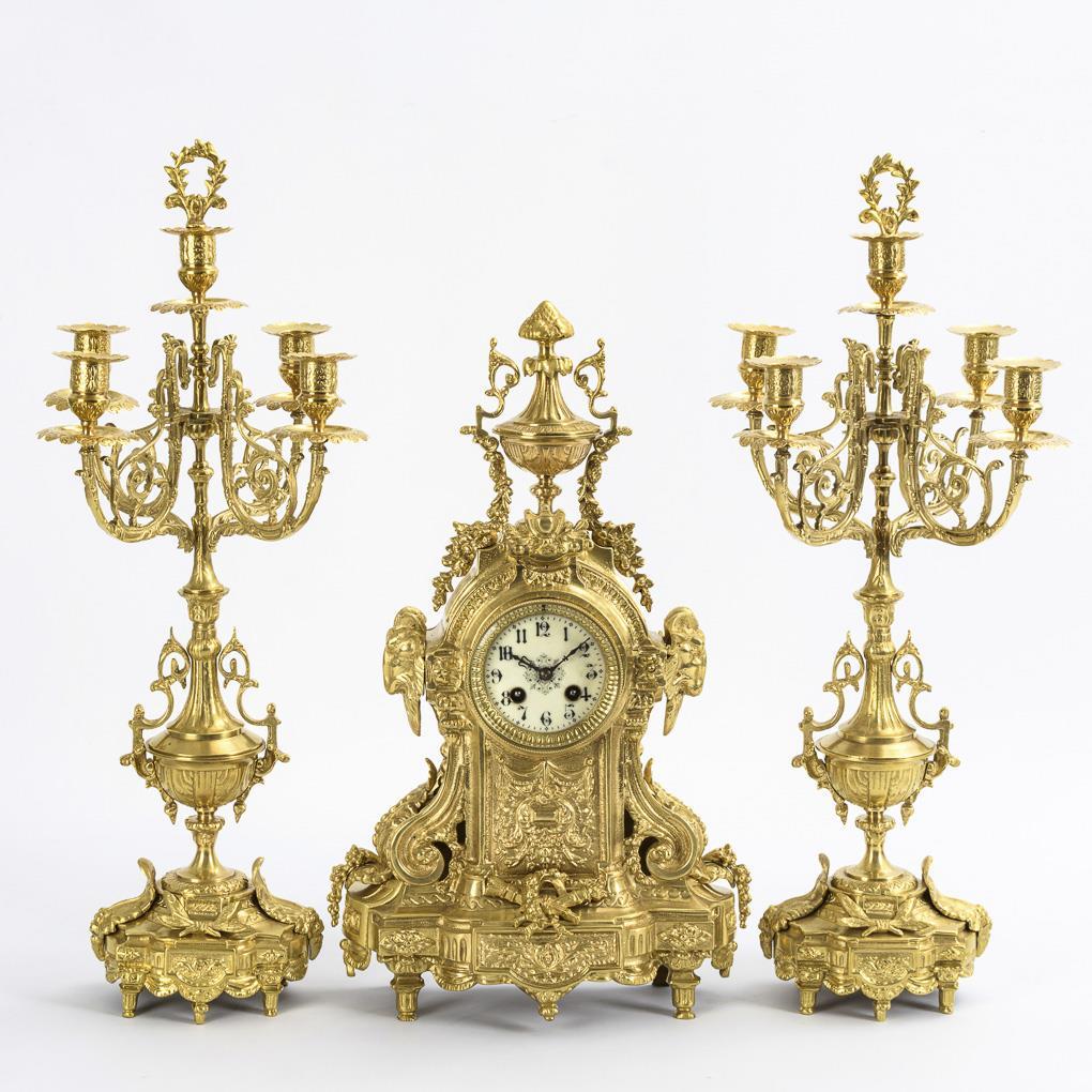 Messing. Uhr ca. 50 x 28,5 x 13 cm, 7 kg. Beisteller H 61 cm, je 3,1 kg.