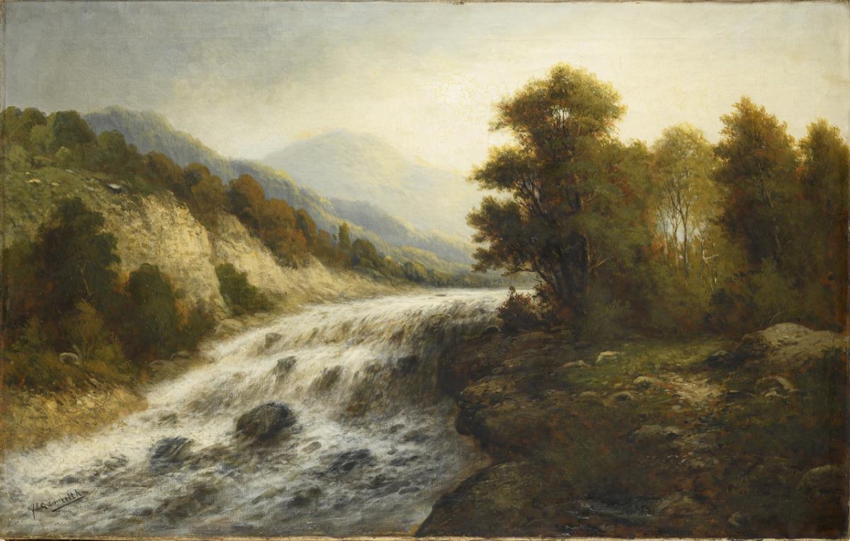 Reißender Fluss in felsigem Bett an einem hellen Tag unter wolkigem Himmel. Altersspuren, retuschiert.