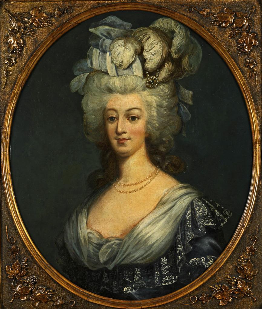Porträt einer jungen Frau mit grauer Perücke, Perlenkette und mit Spitze besetztem Kleid vor blauem Hintergrund. Restauriert mit Hinterklebungen.