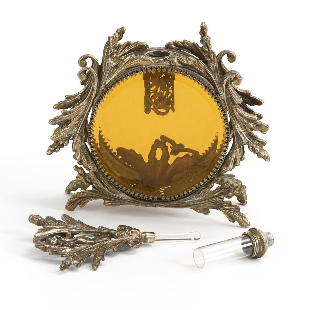 Beidseitig verglaster, reich dekorierter Schaubehälter mit eingeschraubtem Flacon; dessen Stöpsel mit Amorettengriff als Bekrönung. Im Inneren Flaconverkleidung und eine Taube an Zweigen.