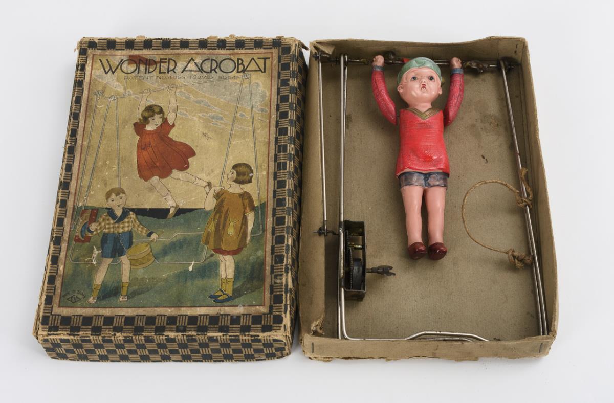 Mechanische Figur "Wonder Acrobat" im Originalkarton.