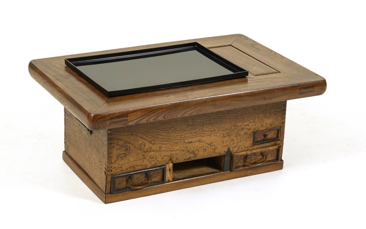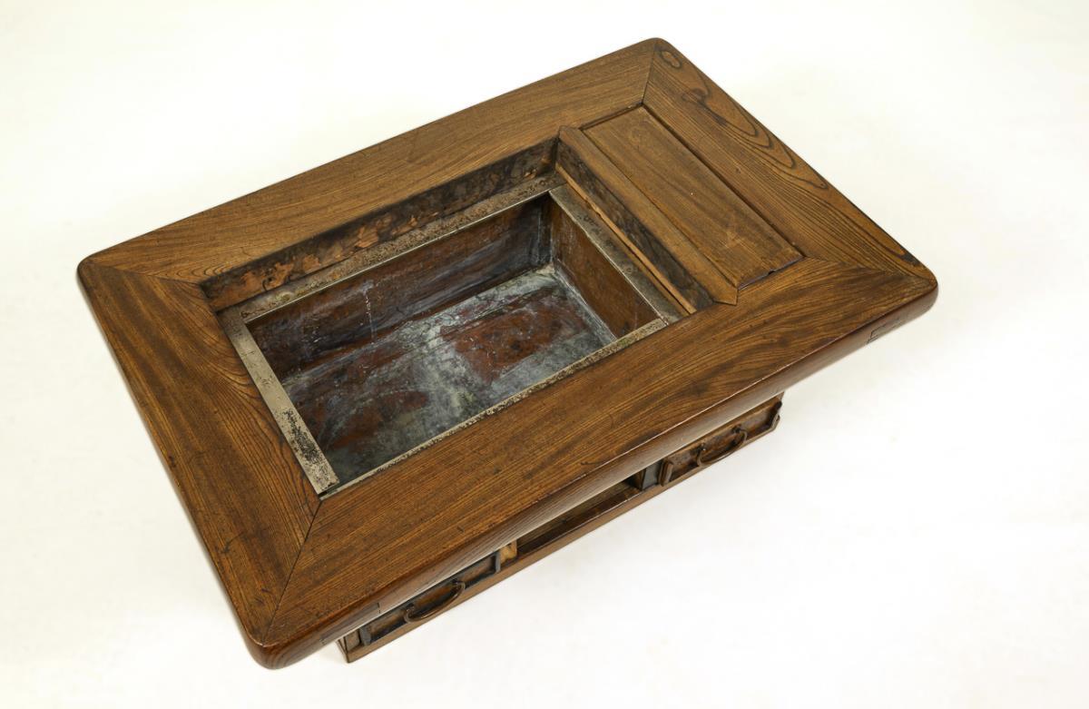 Rechteckiger Korpus mit Griffen und vier kleinen Schubkästen. In der massiven Tischplatte eingelassen ein verzinkter, oben offener Kasten und ein weiteres Fach mit Holzdeckel. Unterbau und Platte in verschiedenen Holzmaserungen. Dazu jüngeres, schwarzes Plastetablett als Abdeckung. Ein Schub und einige Leisten fehlen, wohl auch die Innenleisten in der Plattenöffnung. Gebrauchsspuren.