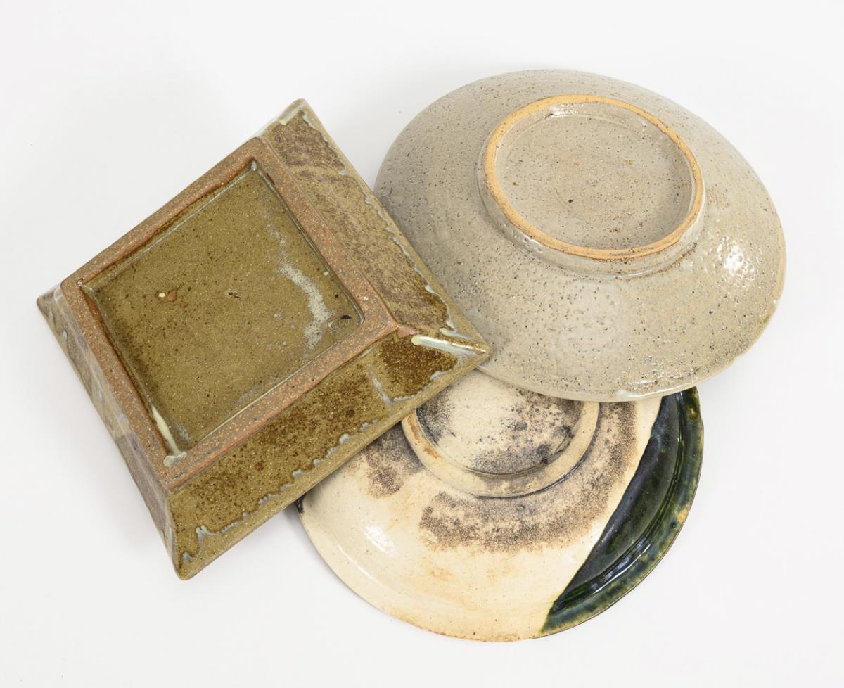 Teller mit Kreuzdekor: Rand mit Stempelmuster und gekämmter Struktur, sowie anderen Glasuren und Unterseite mit grober Engobe. Ø 24 cm. / Teller mit einfachem Blumendekor auf weißer Glasur, ein Randteil mit grüner Glasur und einer alten Reparaturstelle, Unterseite wohl mit Rakutechnik. Ein Haarriss, Ø 23 cm. / Quadratische Schale mit mindestens drei verschiedenen Glasuren, eventuell gemarkt. 19,5 x 19,5 cm.