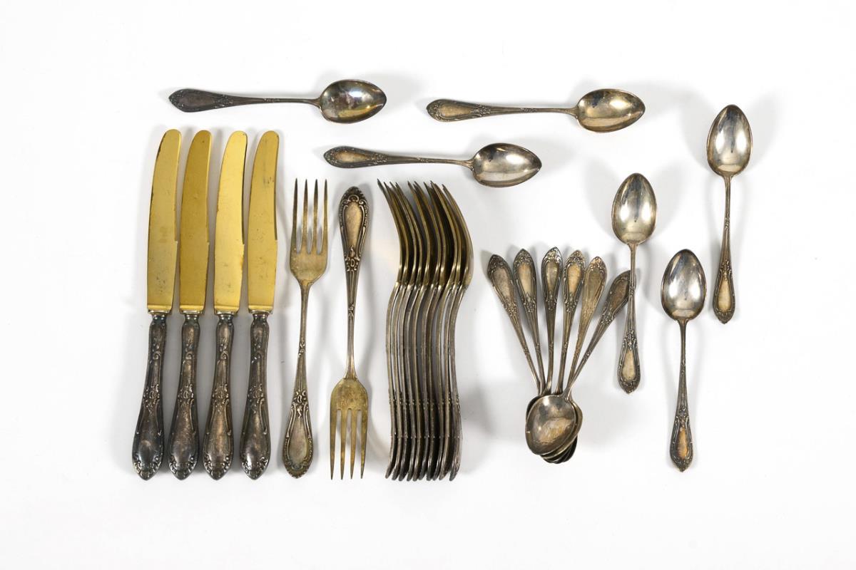 28 Teile mit Rocaillenrelief: 4 Obstmesserchen mit vergoldeter Klinge, 12 Obstgabeln und 12 Mokkalöffel. Leichte Altersspuren.