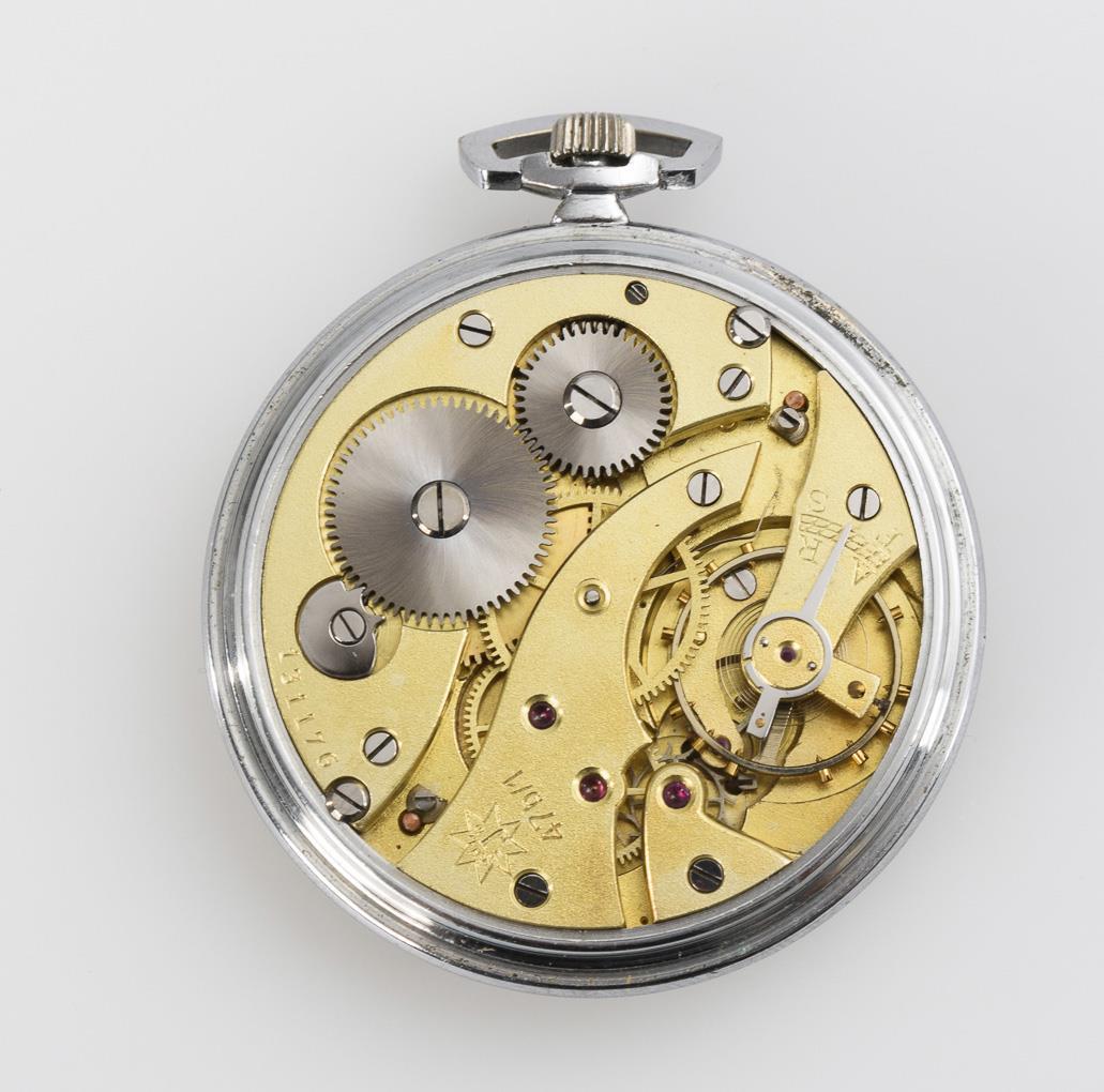 Gemarktes Werk mit Schweizer Ankerhemmung und Kronenaufzug. Läuft. Gemarktes, versilbertes Zifferblatt mit arabischen Zahlen, Minutenkranz, kleiner Sekunde und gebläuten Stabzeigern.