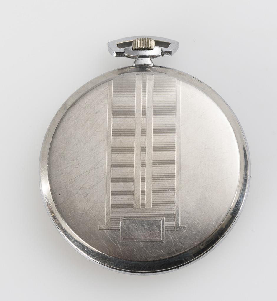 Flaches Lépine-Gehäuse mit geometrisch verziertem Rückdeckel. Minimale Alters- und Gebrauchsspuren.