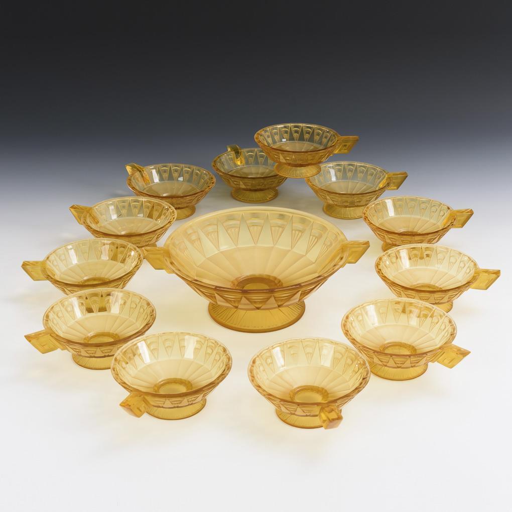 Bernsteinfarbenes, formgepresstes und teils mattiertes Glas mit geometrischem Reliefmuster. 1 Schale (Ø 27,5 cm), 12 Dessertschalen (Ø 15 cm).