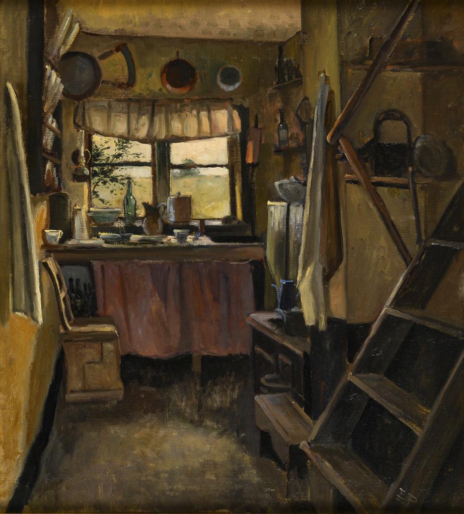 Schmale Küche mit Spüle und Geschirr am Fenster mit Blick hinaus in die Ebene. Eine restaurierte Stelle.
