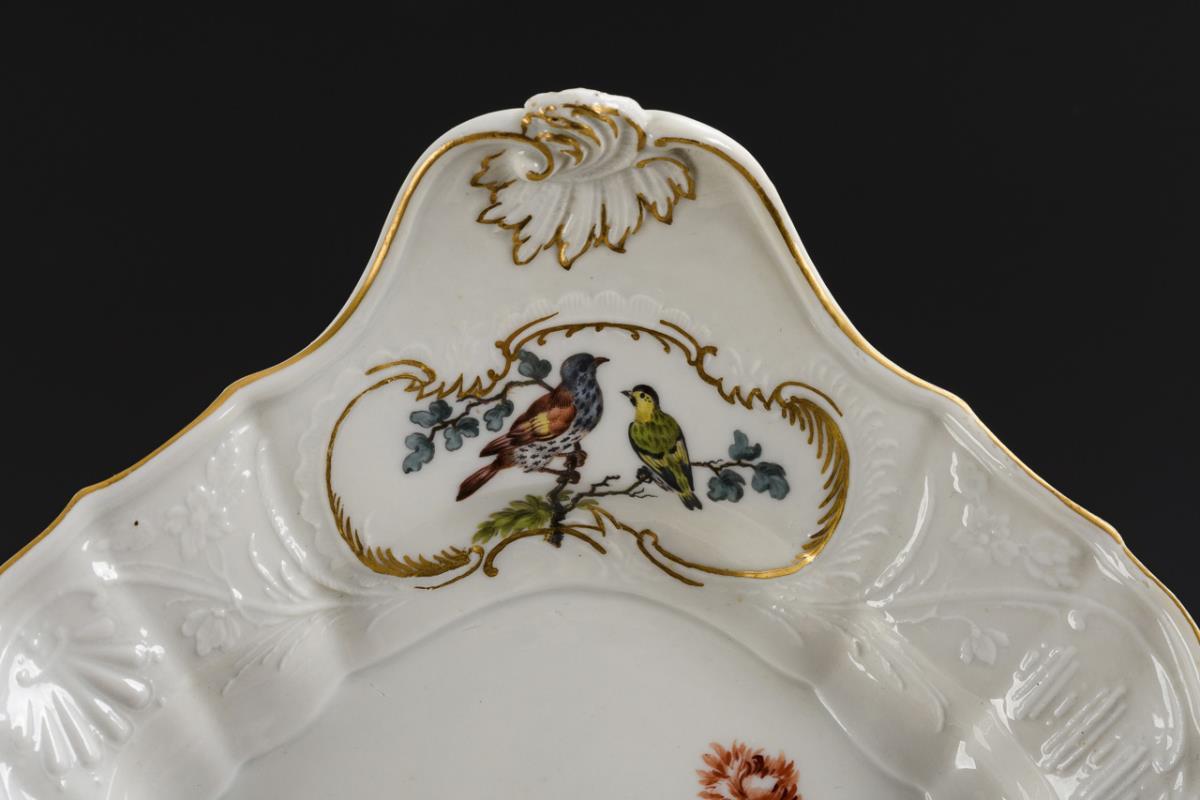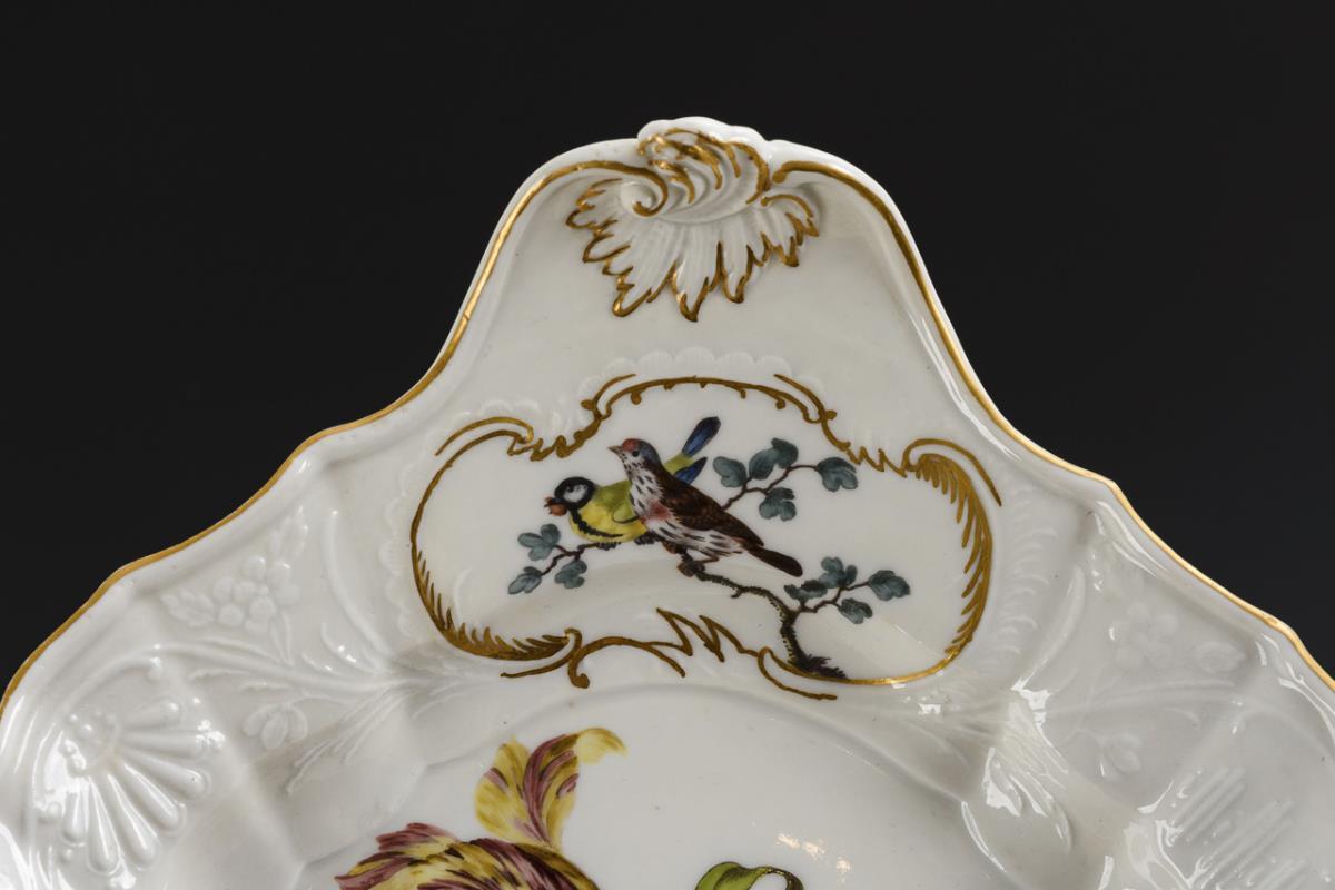Form "Dulong". ovale Platte mit zwei Handhaben. Im Spiegel ein Blumenbukett und Streublumen, in den Rocaillekartuschen die Darstellung von Vögeln. Beschleifung unter der Marke.