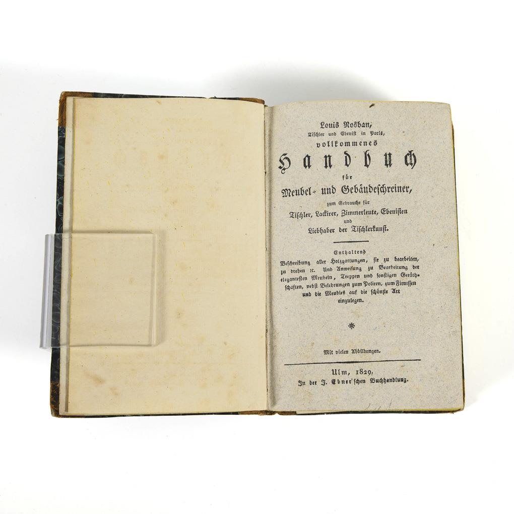 638 Seiten und 4 Tafeln. Halbledereinband mit Gelbschnitt. "Enthaltend: Beschreibung aller Holzgattungen, sie zu bearbeiten, zu drehen etc. Und Anweisung zur Bearbeitung der elegantesten Meubeln, Treppen und sonstigen Geräthschaften, nebst Belehrungen zum Polieren, zum Firnissen und die Meubles auf die schönste Art einzulegen".