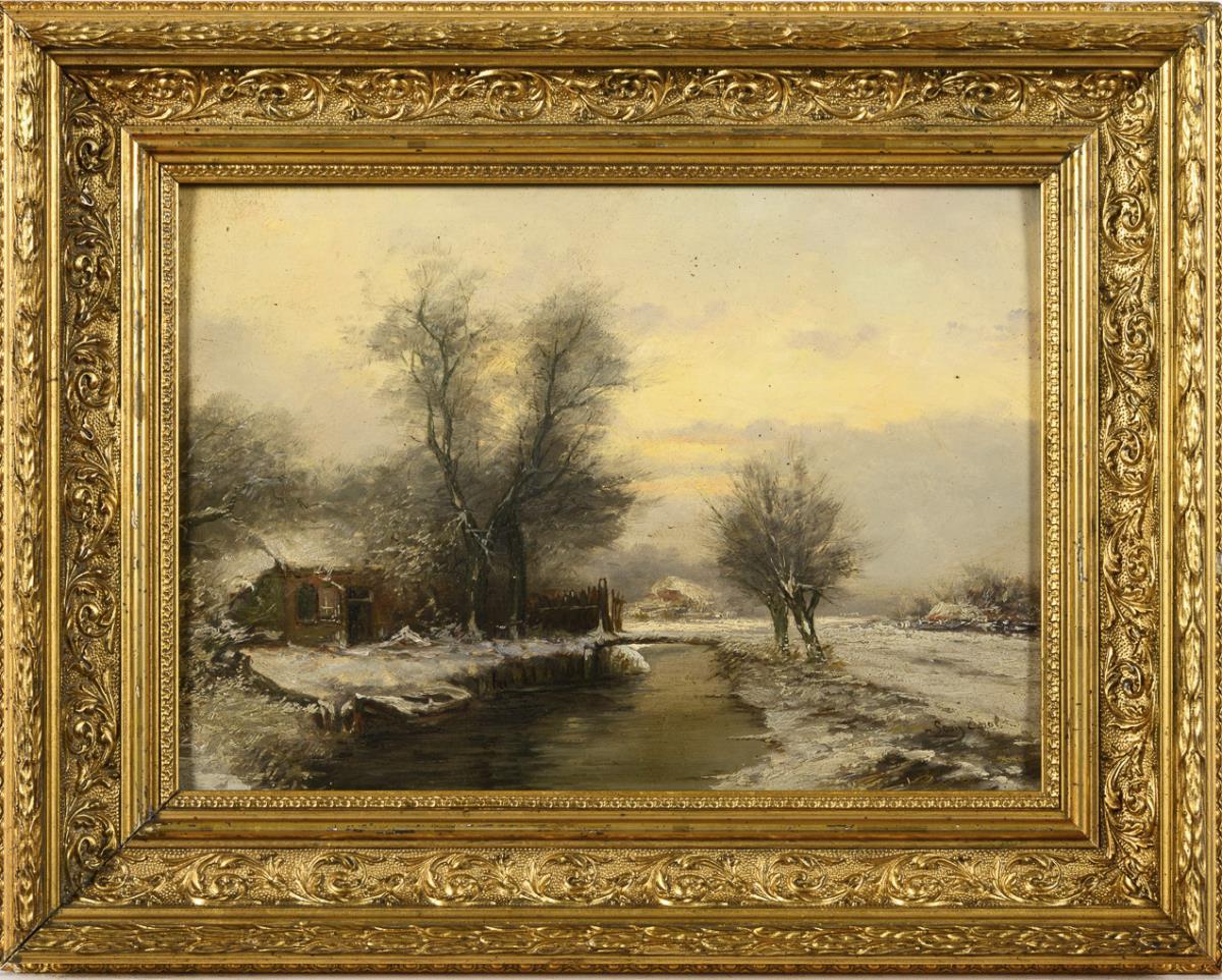Flusslauf zwischen verschneiten Häusern unter leicht wolkigem Himmel am Abend.