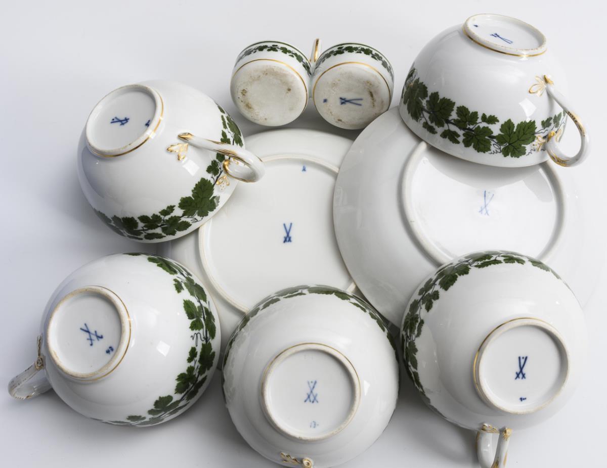 5 Teetassen und Saliere mit Weinlaubdekor. Meissen.