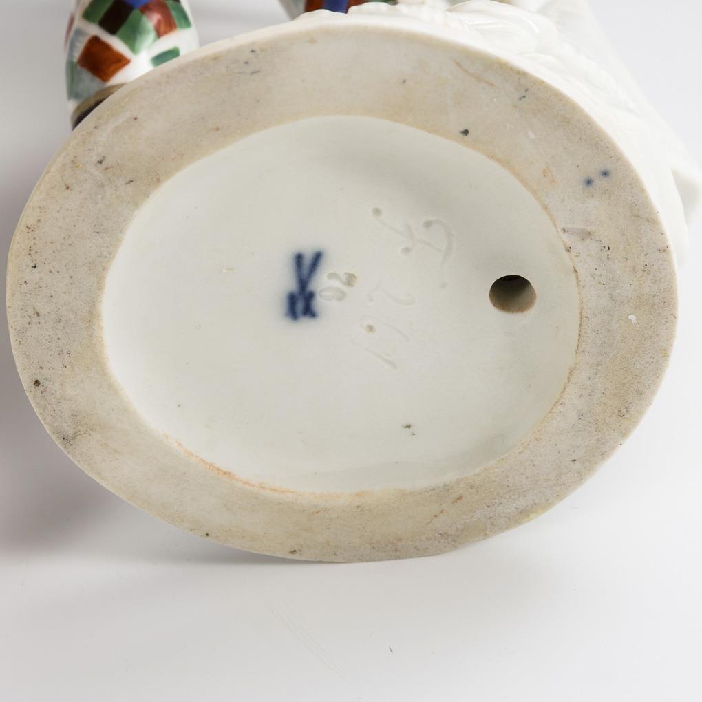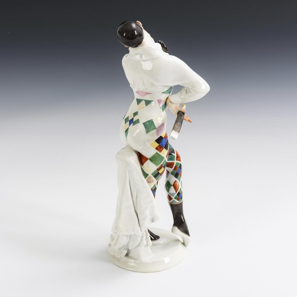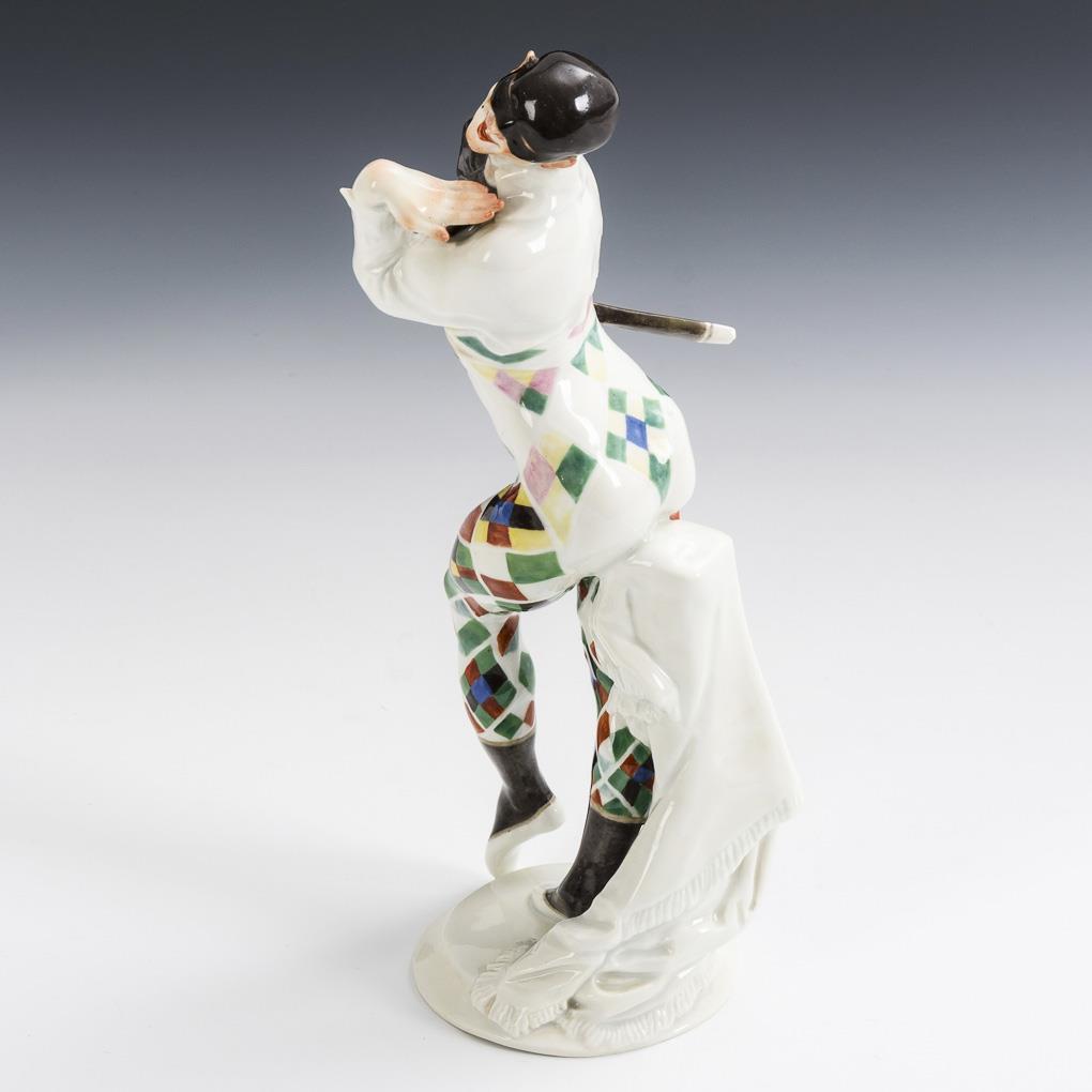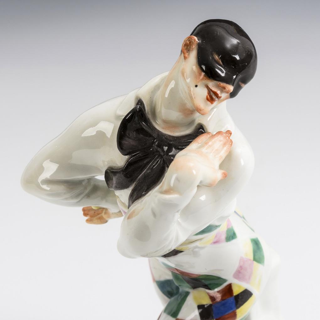 In Tanzpose stehender Harlekin mit Maske. Klatsche und rechte Hand restauriert.