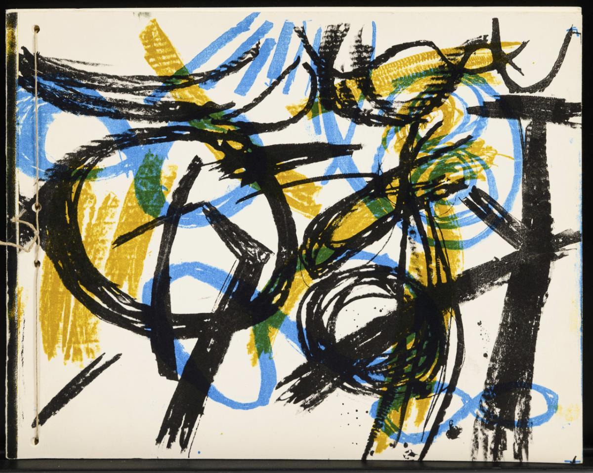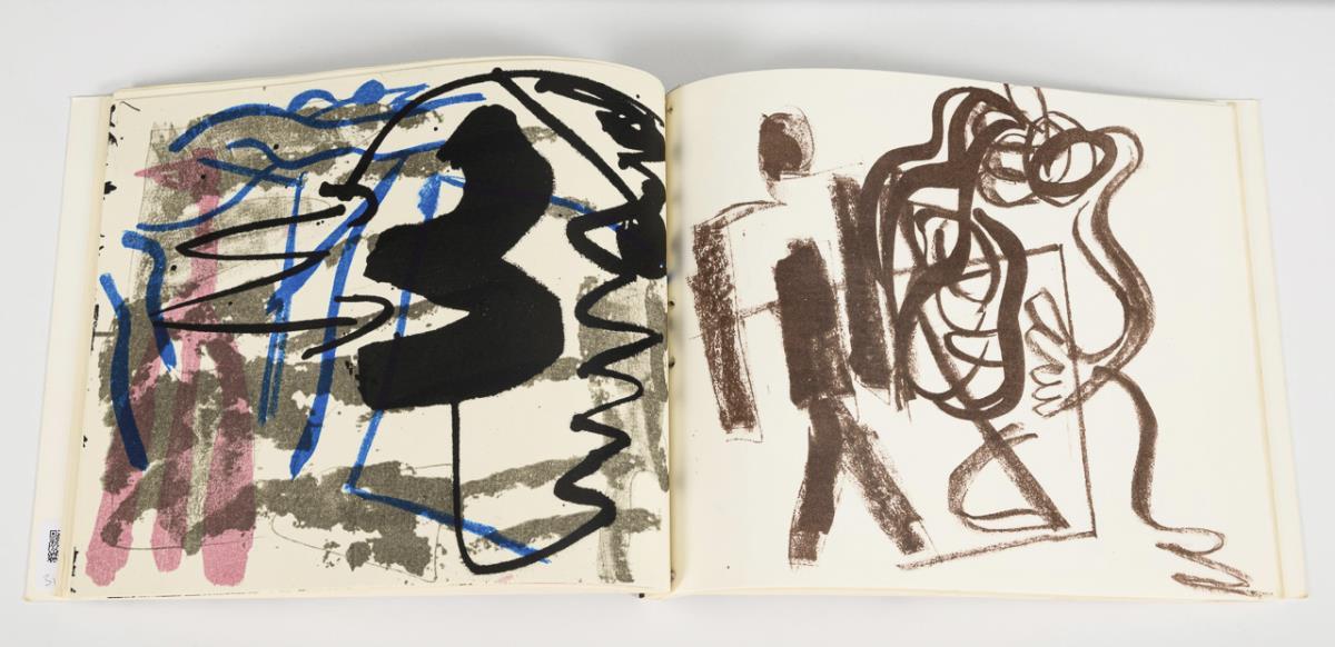 Vollständiger, in Fadenheftung gebundener "Ausstellungskatalog Veit Hofmann" mit Siebdrucken, Offsetdrucken und 2 handsignierten Original-Radierungen des Künstlers, typografischer Text von Matthias Flügge, Exemplar: 49/100, [19]89; Künstlerbücher der DDR im Eigenverlag 1980 - 1989.