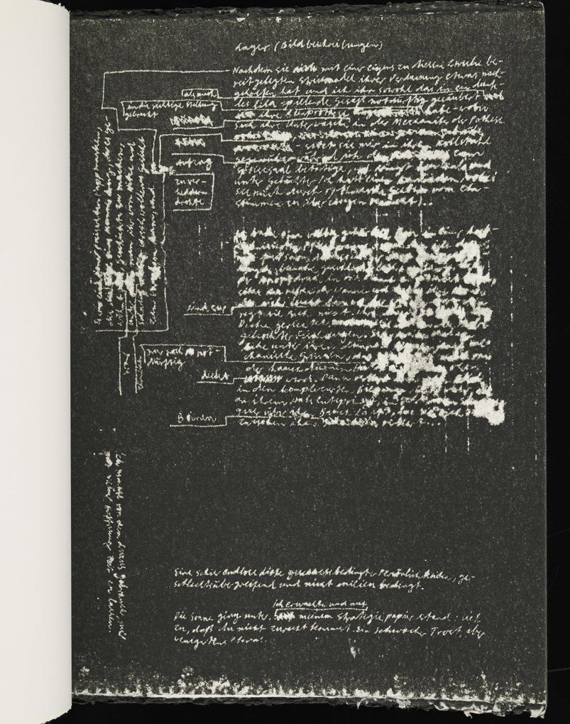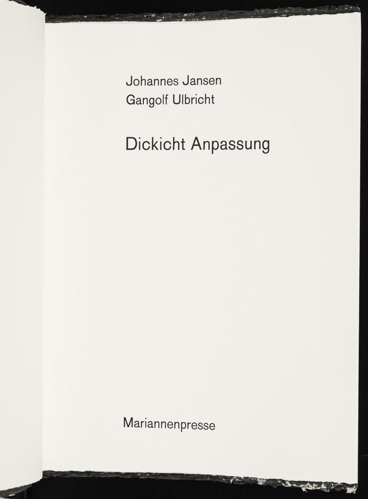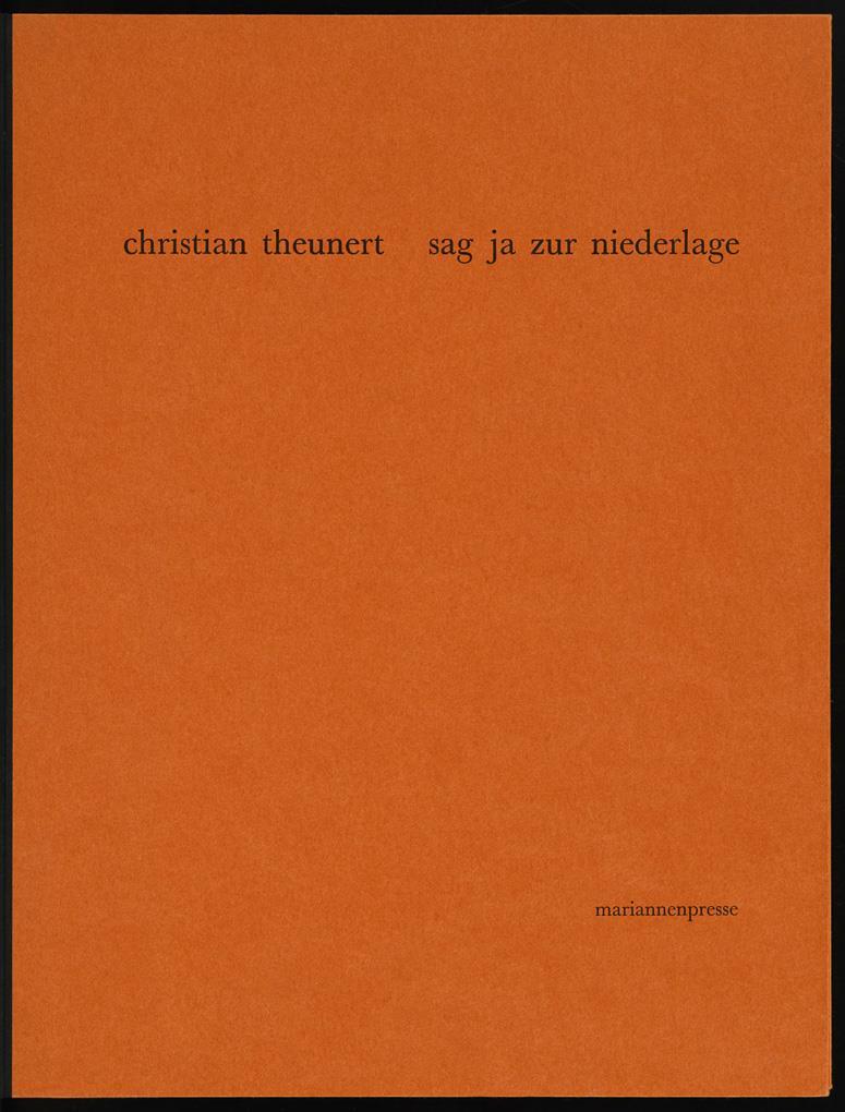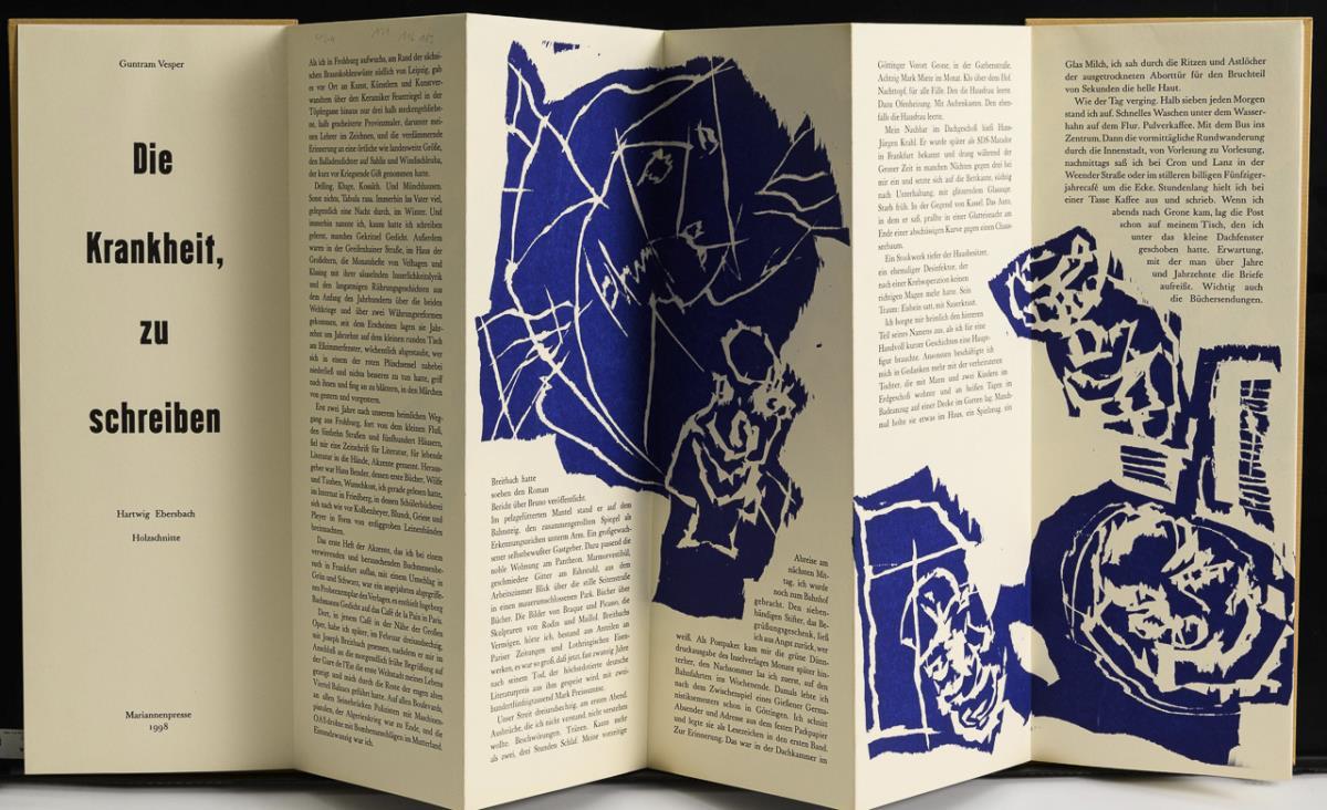 Vollständige Künstlermappe von Christian Theunert "Sag ja zur Niederlage", gebundenes Buch 49 x 38,3 cm, 51. Ausgabe der Edition Mariannenpresse, 1990, Exemplar: 55/100 (+30 römisch nummerierte Exemplare) mit Nachlasssignatur von Jenny Theunert | Vollständige Künstlermappe von Johannes Jansen und Gangolf Ulbricht "Dickicht Anpassung", gebundenes Heft 45 x 35 cm, 91. Ausgabe der Edition Mariannenpresse, 1997, Exemplar: 32/100, Impressum mit Bleistiftsignatur des Autors und des Papiermachers | Künstler-Leporello von Guntram Vesper und Hartwig Ebersbach "Die Krankheit, zu schreiben", Leporello: 43 x 16 cm, 94. Ausgabe der Edition Mariannenpresse, 1998, Exemplar: 5/100 (+30 römisch nummerierte Exemplare), Farbstiftsignatur des Schriftstellers und des Künstlers.