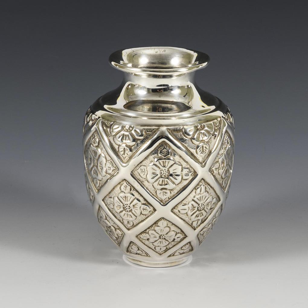 Bauchige Vase mit rautenförmig gegliedertem Blumendekor. Minimal gedellt.