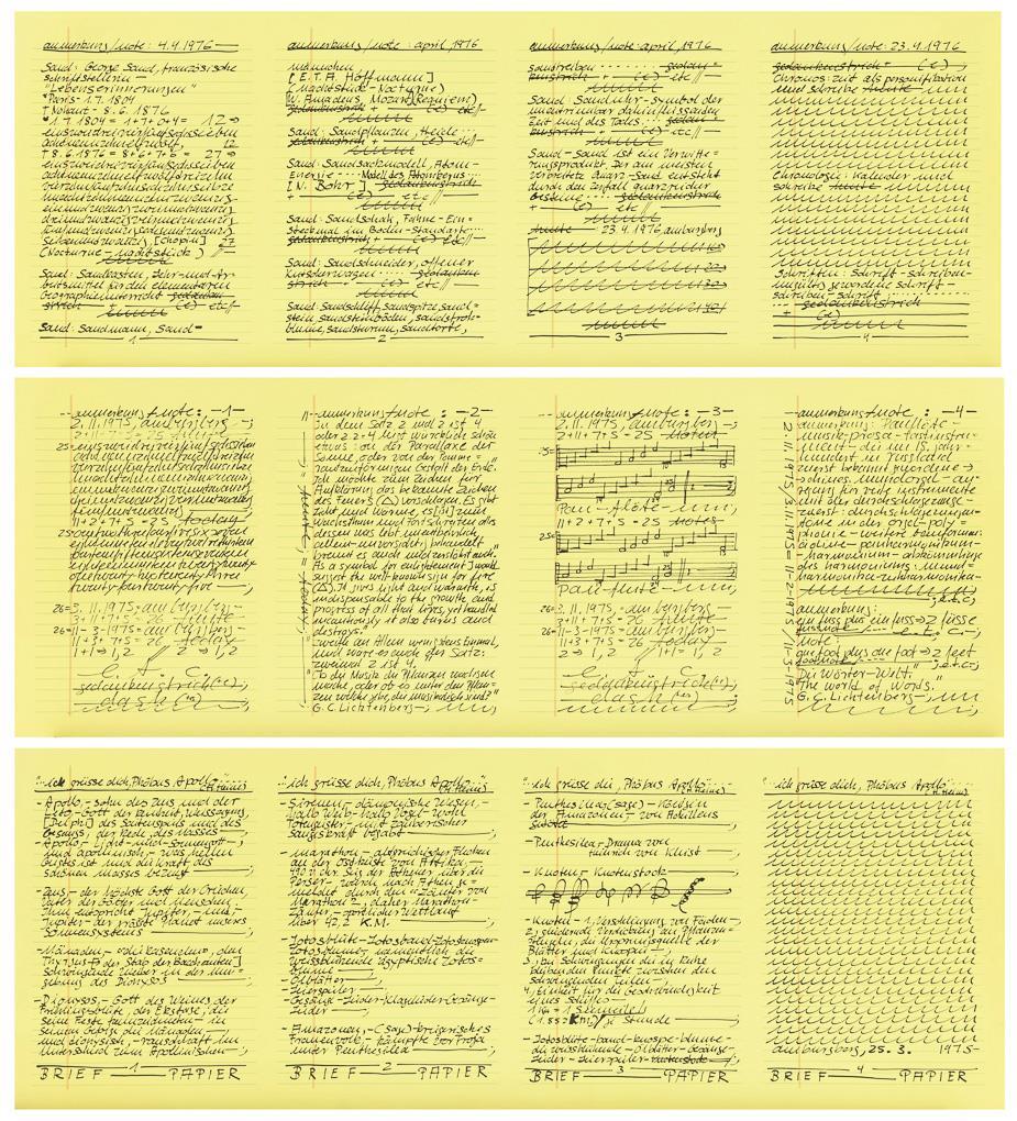 3 handschriftliche Aufzeichnungen: "Ich grüsse dich, Phoebus Apollo, 25.31975" | "anmerkung/note" und "anmerkung, note: 4.41976". Ecken je minimal bestoßen.