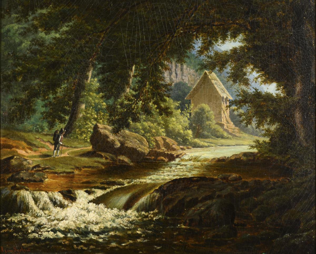 Wanderer auf einem Weg nahe einer Hütte am Fluss in stimmungsvoller Waldlandschaft. Leichte Altersspuren.