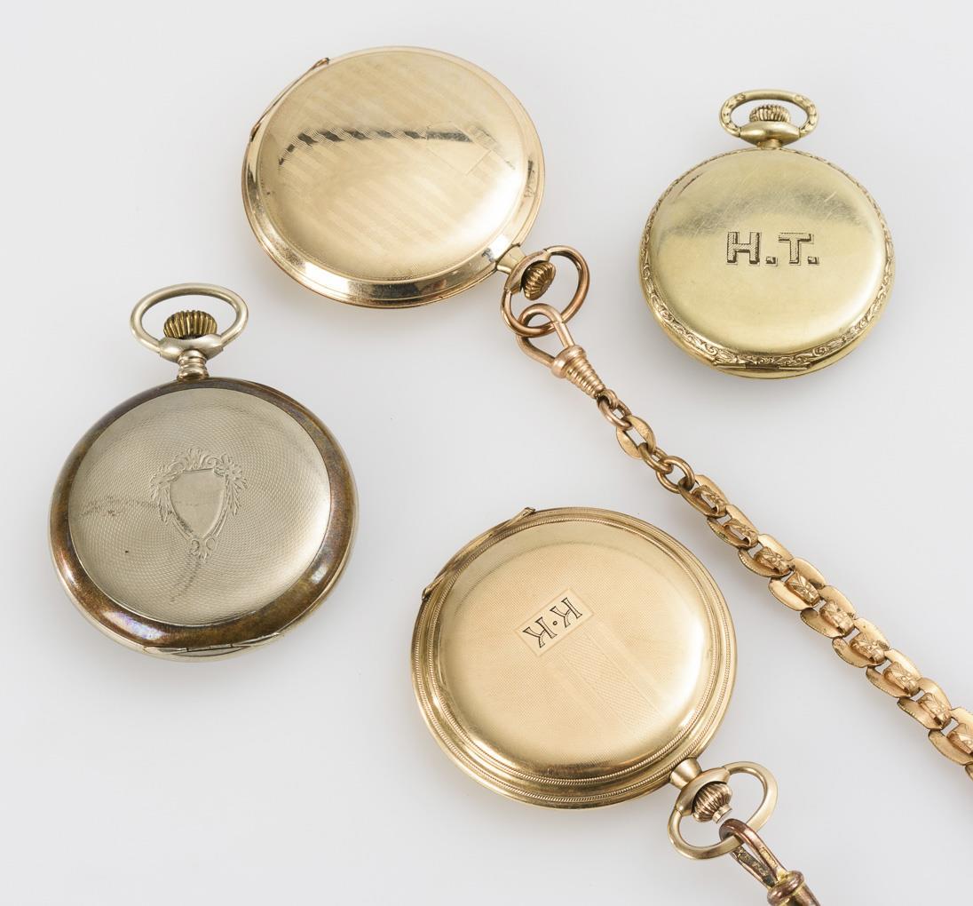 1 silberfarbene Taschenuhr mit guillochiertem Rückdeckel und leerer Wappenreserve, weißes Emailzifferblatt mit arabischen Zahlen und kleiner Sekunde. 3 vergoldete Taschenuhren, davon 2 mit Sprungdeckelgehäuse und vergoldeten Metalluhrenketten. Leichte Alters- und Gebrauchsspuren.