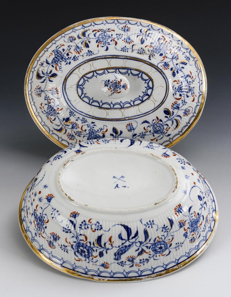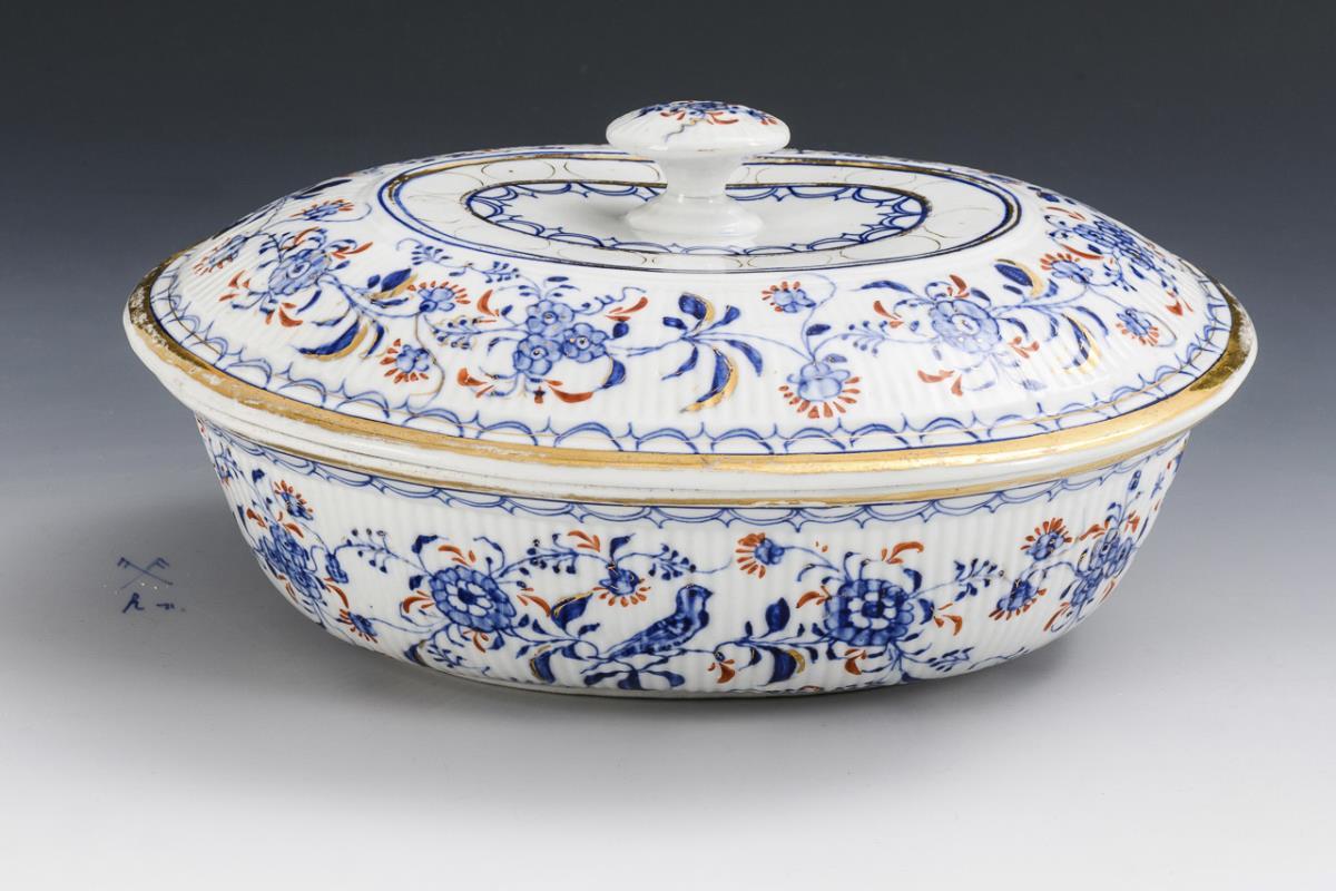 Ovale Schüssel mit gebrochen gerippter Wandung und Knaufdeckel. Gold berieben.