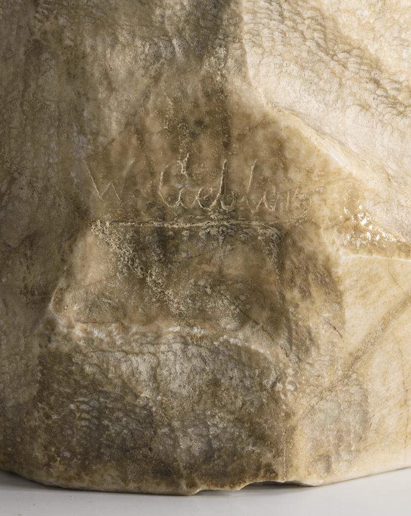 Heller Marmor oder Alabaster, teils gefasst, Glasaugen. Bezeichnet. H 30,5 cm. 3,6 kg.