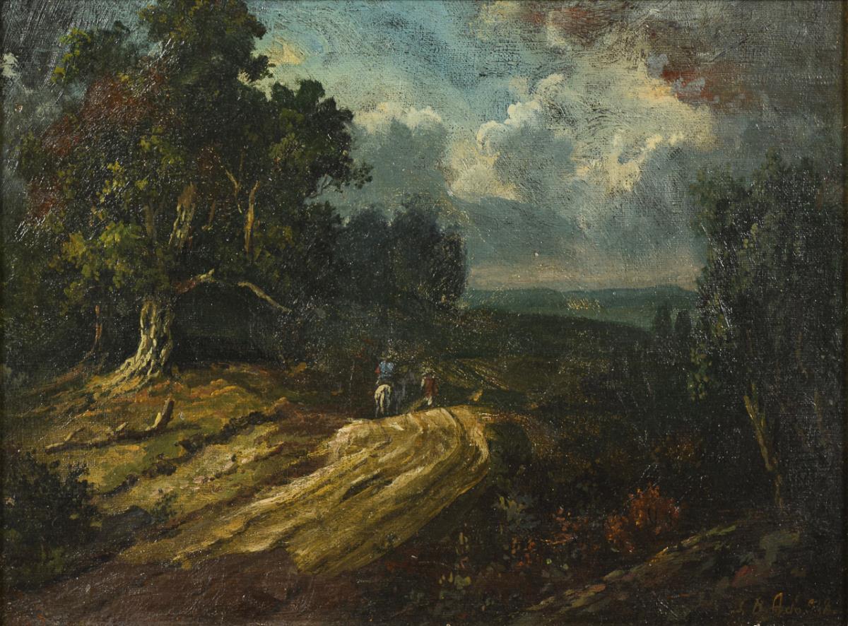 Die Reiter auf einer Straße am Waldrand in bergigem Gelände unter wolkigem Himmel. Minimale Altersspuren.
