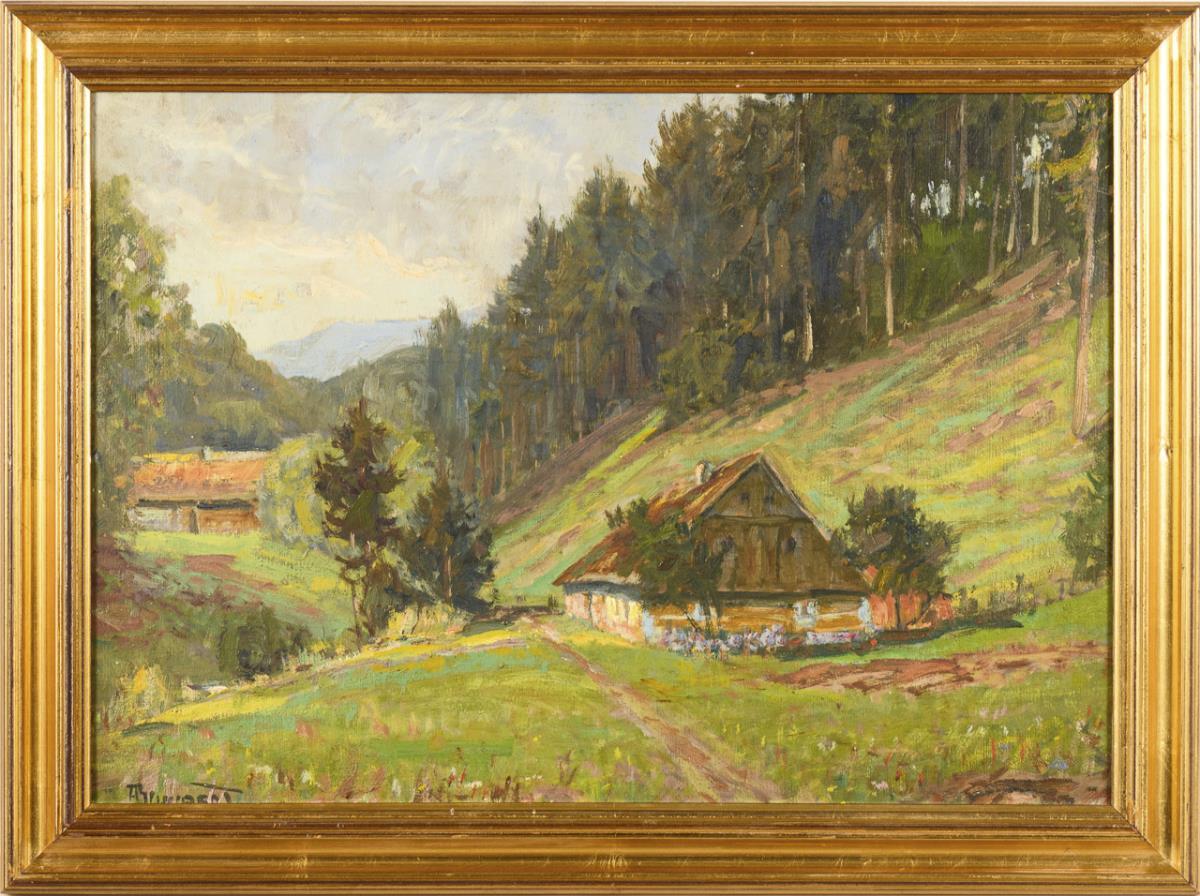 Bauernhäuser zwischen den Waldhängen unter wolkigem Himmel.