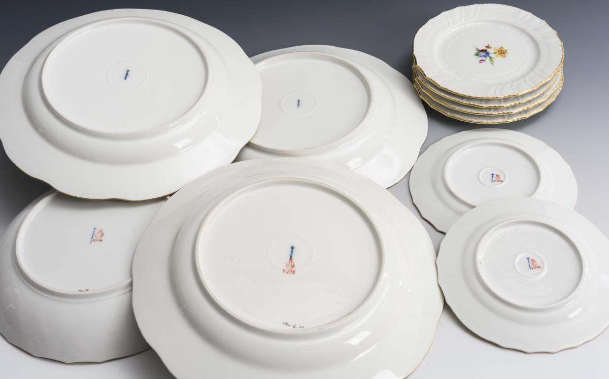 3+6 Teller und 1 Schale mit Blumen- und Insektenmalerei. KPM Berlin.