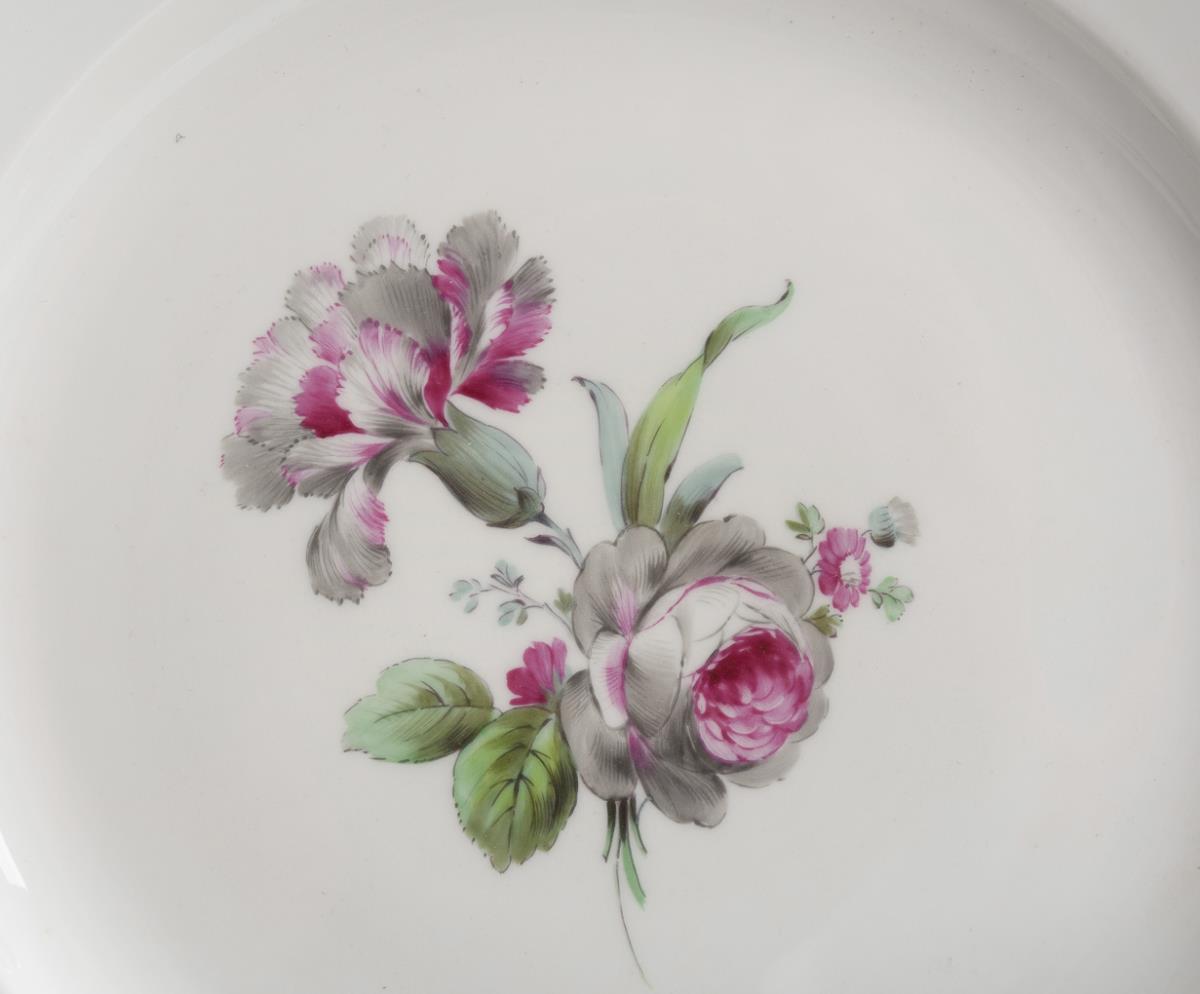 Polychrome Blumenmalerei in Purpur, Grün und Grau. Ø 24,5 cm.