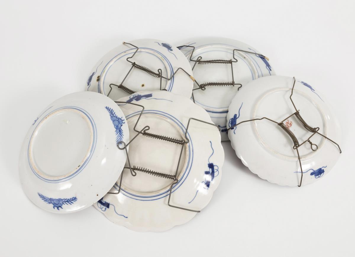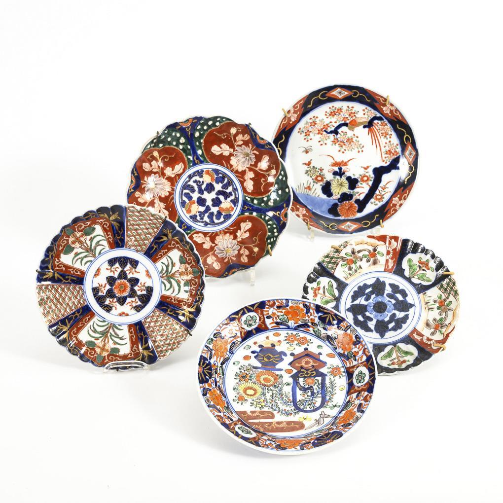 2 mit glattem und 3 mit gewelltem Rand. Unterschiedliche pflanzliche Dekormuster in Rot, Grün und teils goldfarben sowie Unterglasurblau. Vier mit Wandhalterungen.