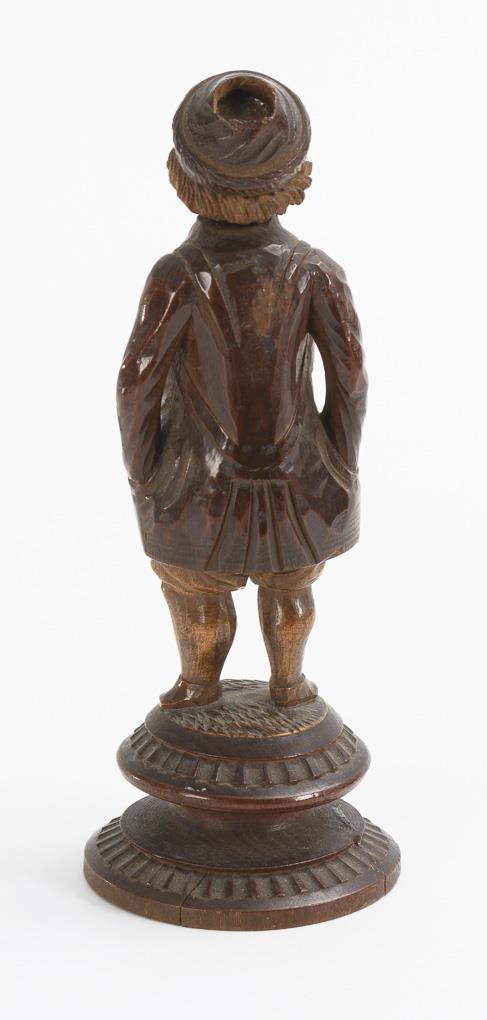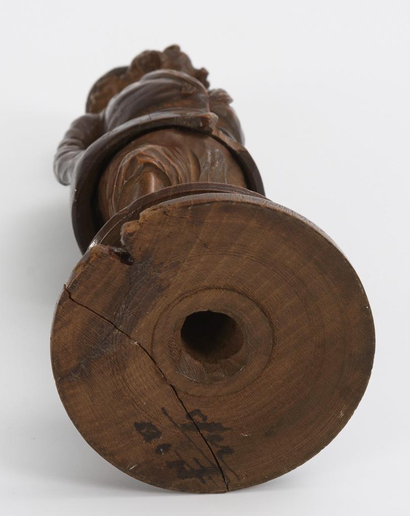 Holz mehrteilig geschnitzt, teils gedrechselt, 2-farbig gebeizt. Wohl 18. Jh. Unter dem Sockel undeutlicher Schriftzug (du nort?). H 15,5 cm.