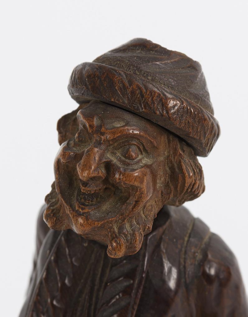 Vollplastische Schnitzfigur des stehenden Bärtigen mit Händen in den Taschen des pelzverbrämten Kurzmantels. Sockel geklebt, Trockenriss ebd., kleiner Ausbruch ebd. und am Mantelsaum, Fehlstelle auf dem Hut.