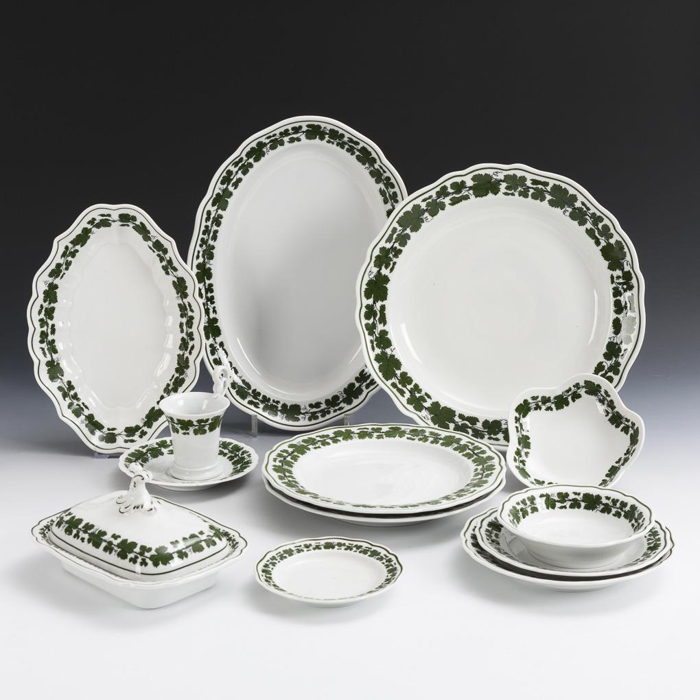 Form "Neuer Ausschnitt": 6 verschiedene Teller (Ø 13,5 - 24,5 cm), 1 Gemüseteller (Ø 32 cm), 1 Ovalplatte (L 35,5 cm), 1 Schälchen (Ø 15 cm), 1 Butterdose (15 x 20 cm) und 1 Ovalschale (L 27,5 cm). / 1 Untertasse in der Form "Großer Ausschnitt" (Ø 15 cm). / 1 Schwanenhenkeltasse (H 10,5 cm). 1 Speiseteller mit Glasurfehlern.