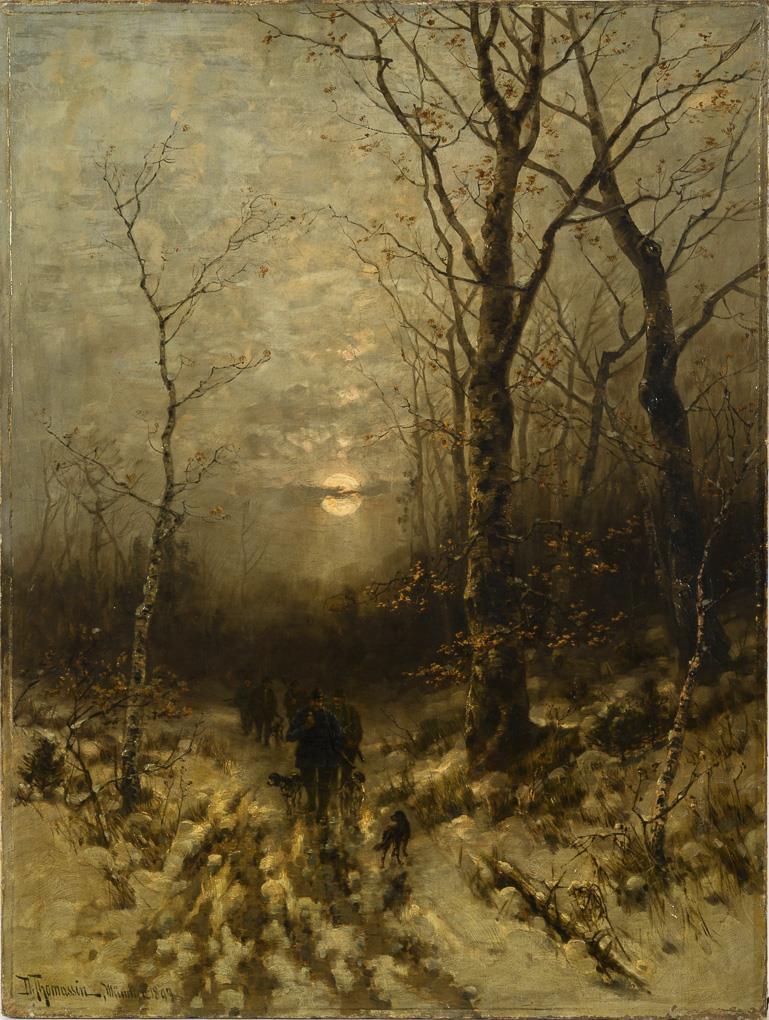Mehrere Jäger mit Hunden auf einem matschigen Weg durch die verschneite Waldlandschaft im Licht des Vollmondes. Altersspuren.