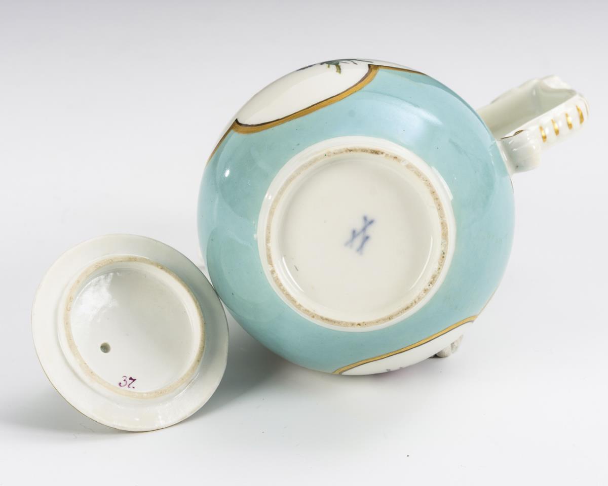 Birnkännchen mit türkisblauem Fond, beidseitig in einer Vierpasskartusche ein Blumenbukett. Blütenknauf bestoßen.
