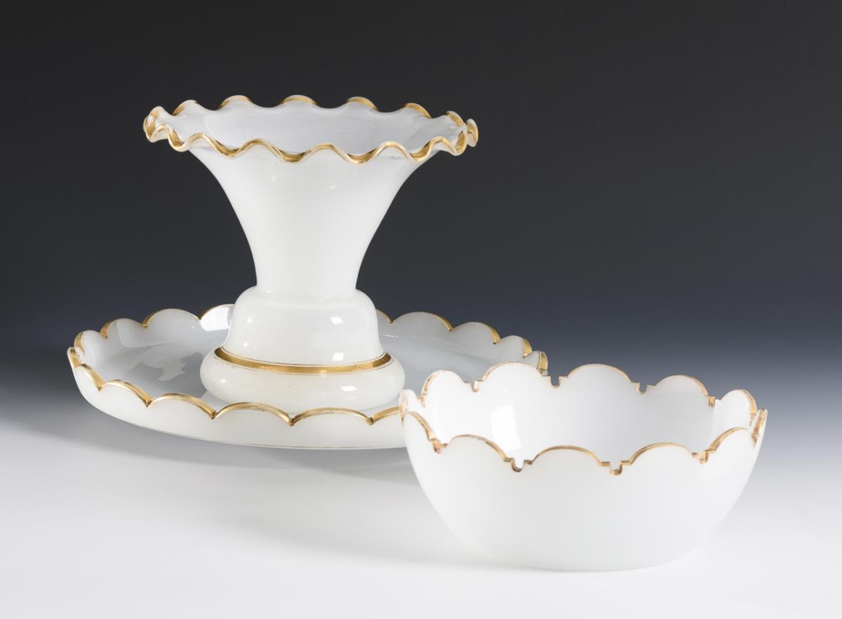 2x Glashütte SCHACHTENBACH: Presentoir (Ø 31,5 cm) und Schale (Ø 21 cm). / 1x BAYERISCHER WALD: Vase mit gewelltem Rand (H 18,5 cm). Partieller Goldabrieb.