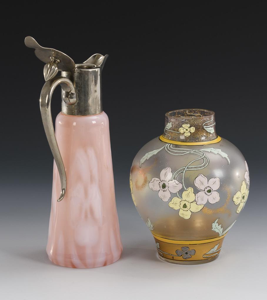 1x Balustervase aus farblosem, matt irisiertem Glas mit Blütenranken in Reliefemail, goldstaffiert (H 15 cm). / 1x konisches Kännchen aus farblosem Glas mit rötlichem, streifigem Innenfang und Opalglasüberfang, metallmontierte Mündung und Henkel (H 23 cm). 1x Goldrand berieben und mit kleinen Bestoßungen.
